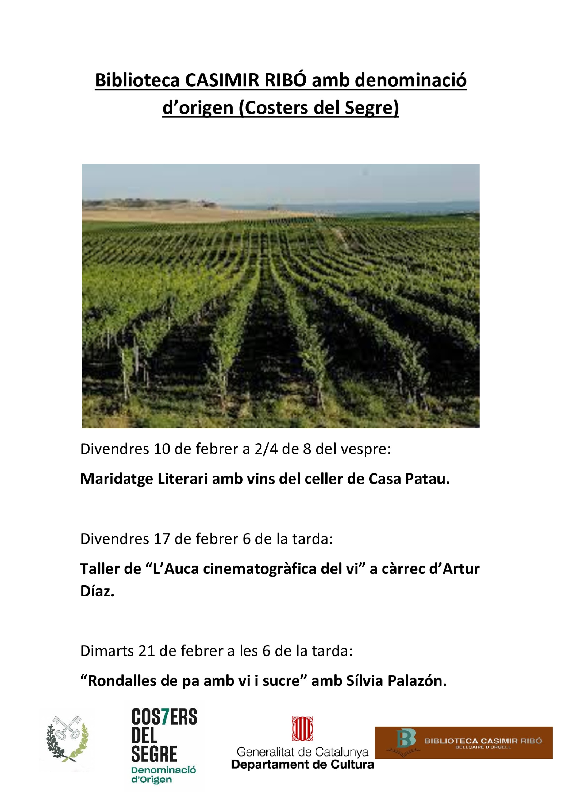 La Biblioteca Casimir Ribó de Bellcaire d'Urgell acull aquest divendres la segona activitat del cicle amb denominació d'origen, Costers del Segre. Serà el taller 'L'auca cinematogràfica del vi' i el realitzarà Artur Díaz