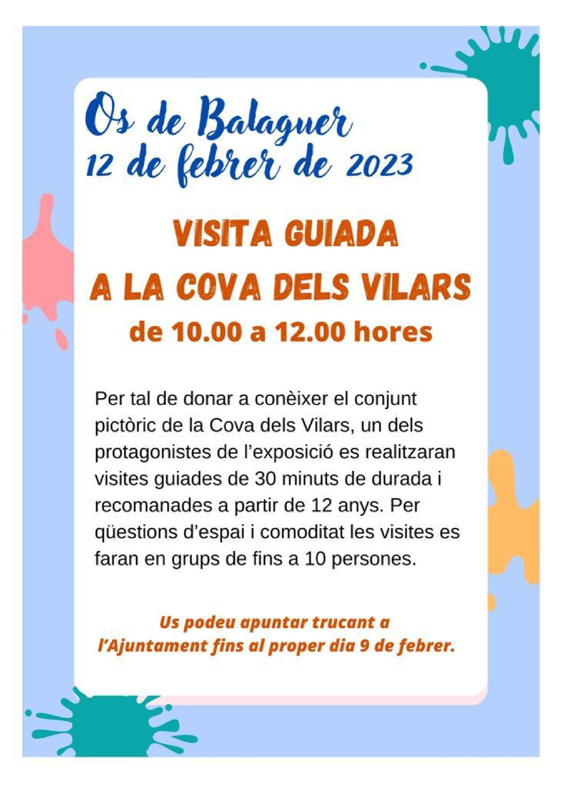 Os de Balaguer programa, el diumenge 12 de febrer, visites a la Cova dels Vilars, un taller infantil d'art rupestre i una conferència. Les activitats es realitzen en el marc de l'exposició Prehistart, Art prehistòric a la Noguera