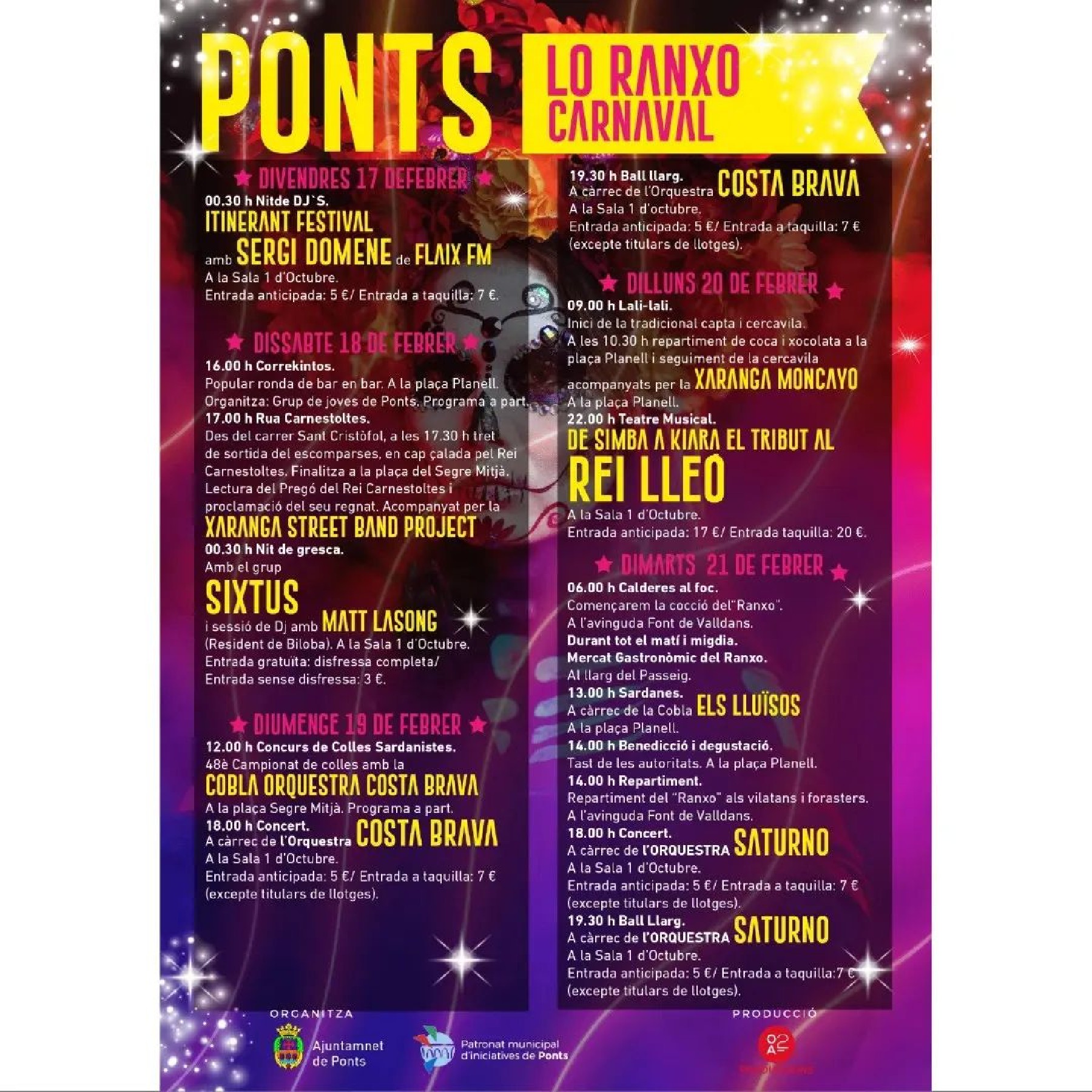 Ponts celebrarà el tradicional Ranxo de Carnaval el dimarts 21 de febrer, amb la cocció del Ranxo i un mercat gastronòmic. La celebració s'allargarà tot el cap de setmana i inclourà teatre, sessions de dj, concerts i balls entre altres propostes