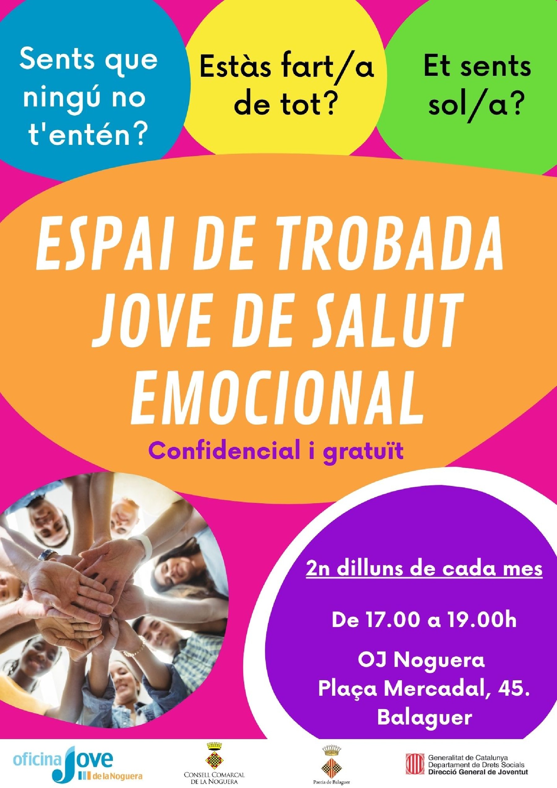 El dilluns 13 de febrer, segona sessió de l'Espai de Trobada de Salut Emocional de l'Oficina Jove . Obrirà el segon dilluns de mes, de 17.00 h a 19.00 h