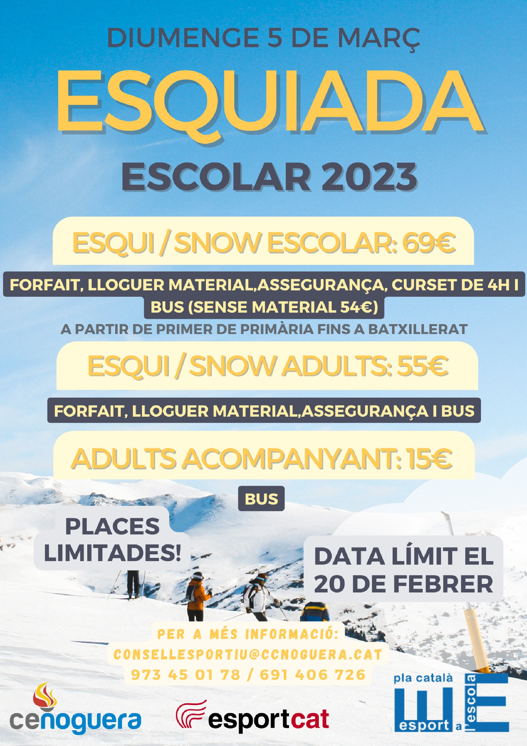 El Consell Esportiu de la Noguera obre les inscripcions per a l'Esquiada Escolar, que tindrà lloc el diumenge 5 de març a Port Ainé. S'adreça a infants de 1r de primària i fins a batxillerat i s'hi poden apuntar també adults acompanyants