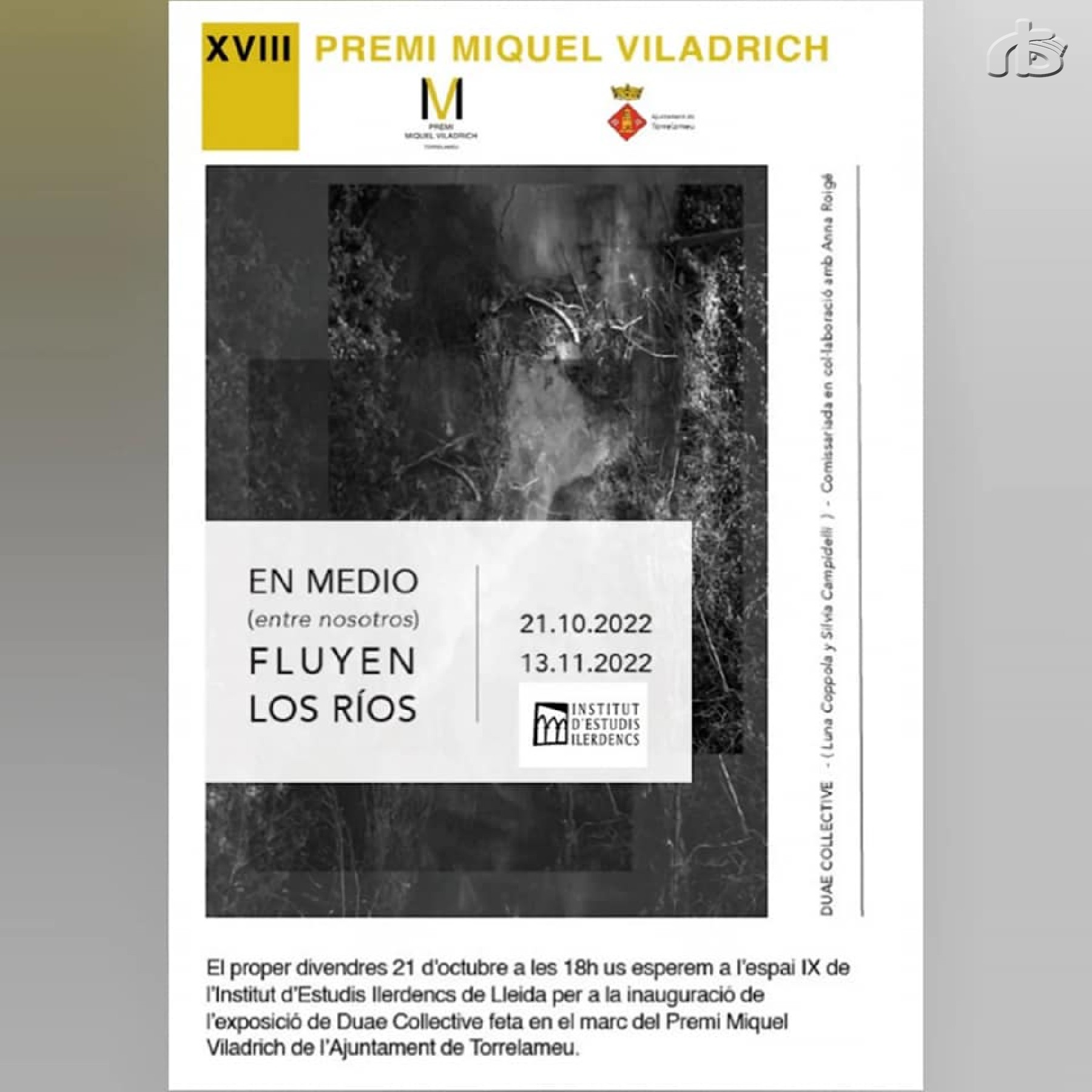 L'Institut d'Estudis Ilerdencs de Lleida acull l'exposició 'EN MEDIO (ENTRE NOSOTROS) FLUYEN LOS RIOS' de Duae Collective, emmarcada dins la categoria d'Arts Visuals Aplicades a la Comunitat i al Territori de Torrelameu del Premi Miquel Viladrich