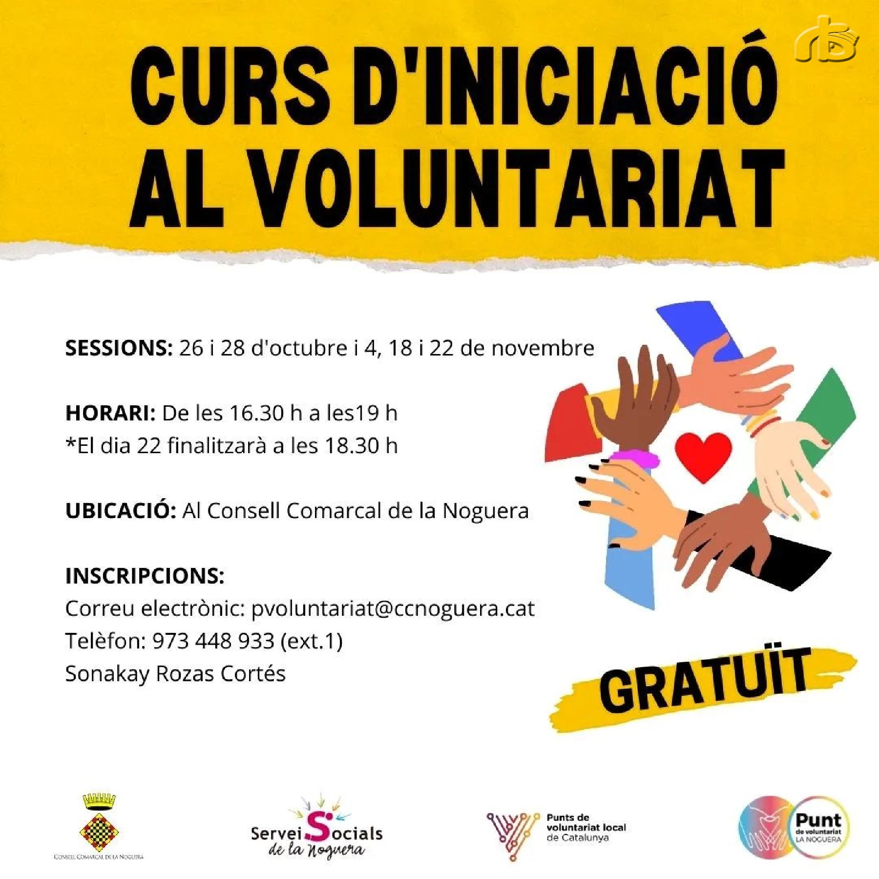 El Consell Comarcal de la Noguera oferirà properament un curs d'iniciació al voluntariat. Està adreçat a totes aquelles persones majors de 16 anys que vulguin col·laborar en esdeveniments que s'organitzin des de l'àrea de Serveis Socials