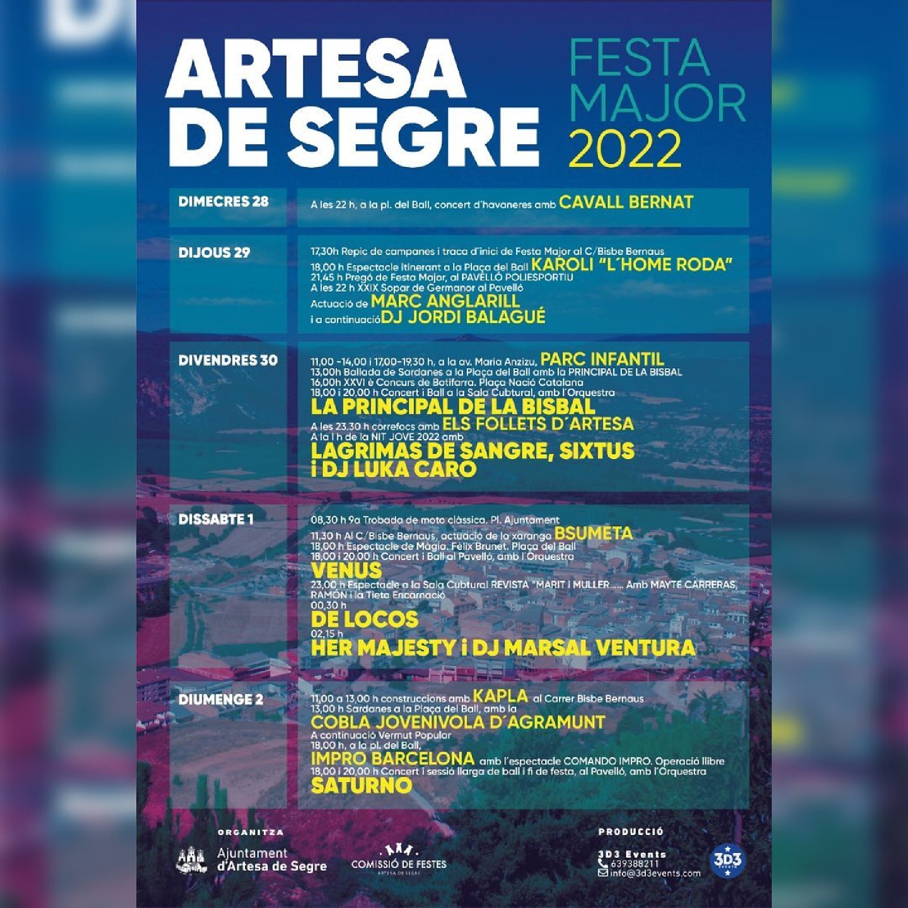Artesa de Segre celebra la festa major del 28 de setembre al 2 d'octubre. El programa inclou sardanes, havaneres, balls i concerts, i les sessions de djs. En destaca la Nit Jove amb Lágrimas de Sangre, Sixtus i el dj Luka Caro