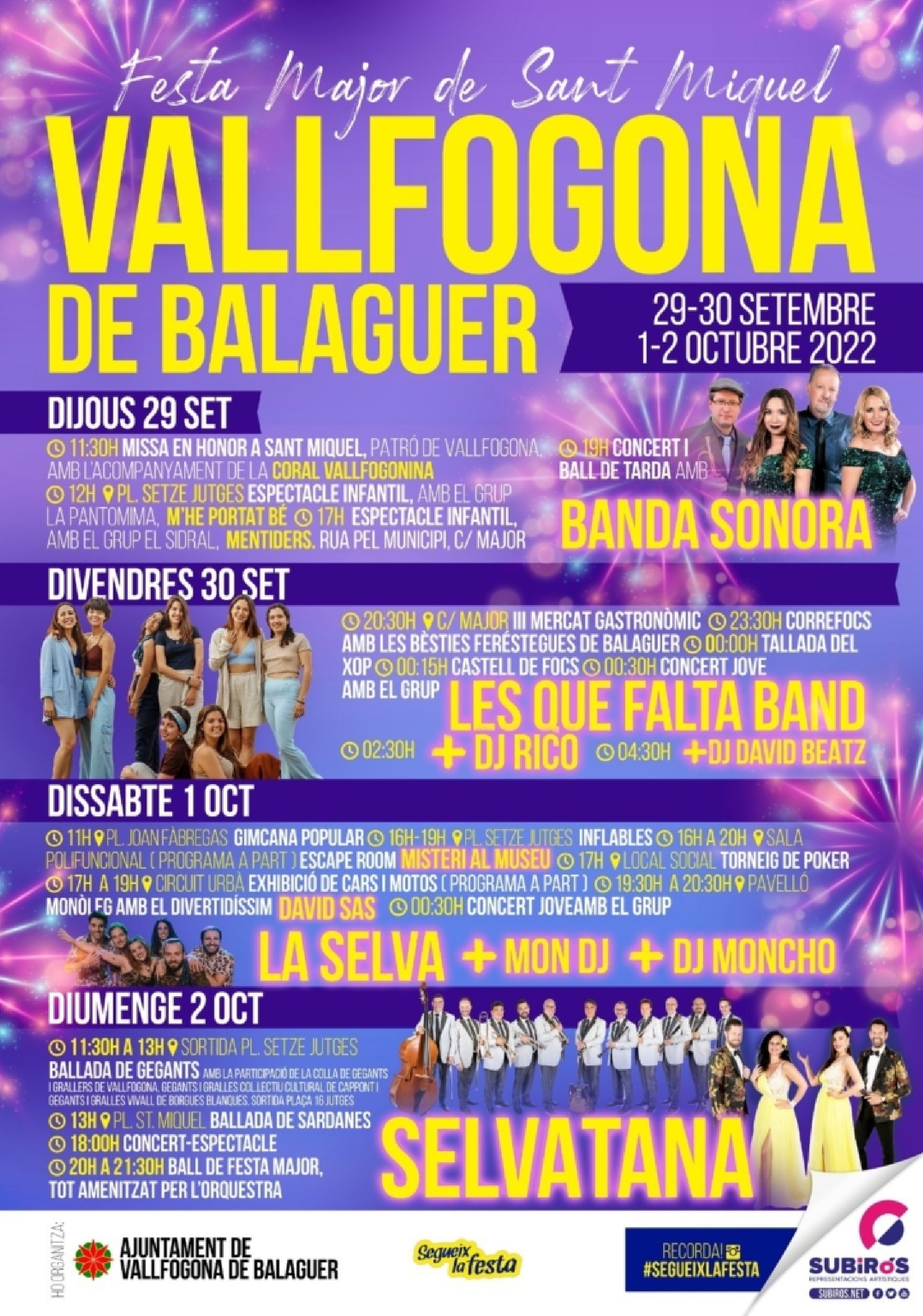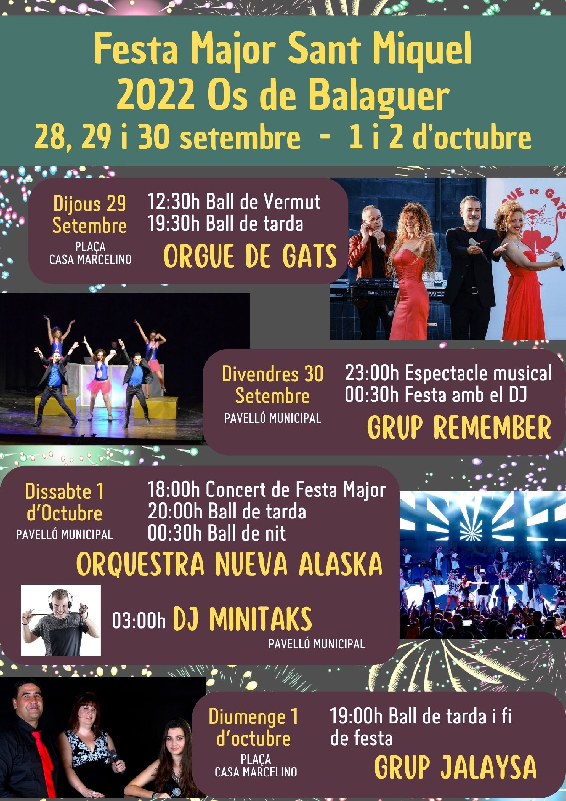 Os de Balaguer celebrarà la festa major en honor a Sant Miquel del 28 de setembre al 2 d'octubre, amb balls, concerts orquestrals i djs, i amb la 7a Trobada Gegantera i Grallera com in dels actes destacats