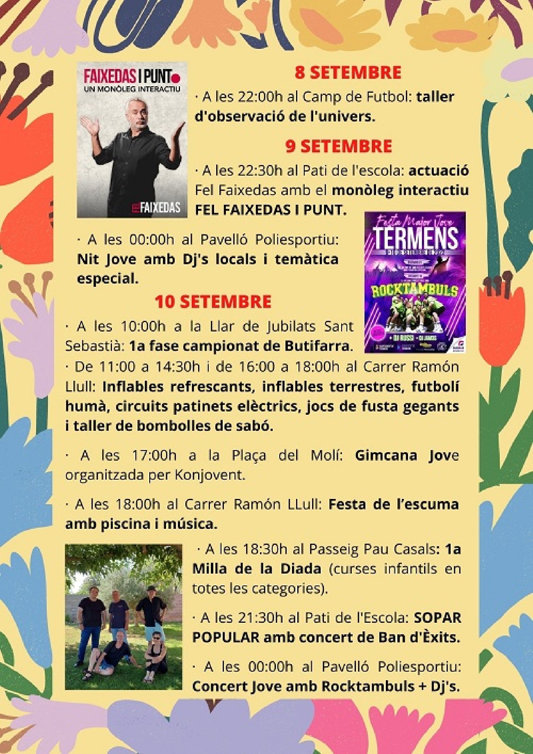 Térmens celebra la festa major. Destaca el teatre de Fel Faixedas, el concert nocturn amb els grups Rocktambuls i el ball de l'orquestra Costa Brava. També la presentació del vídeo documental Fem memòria