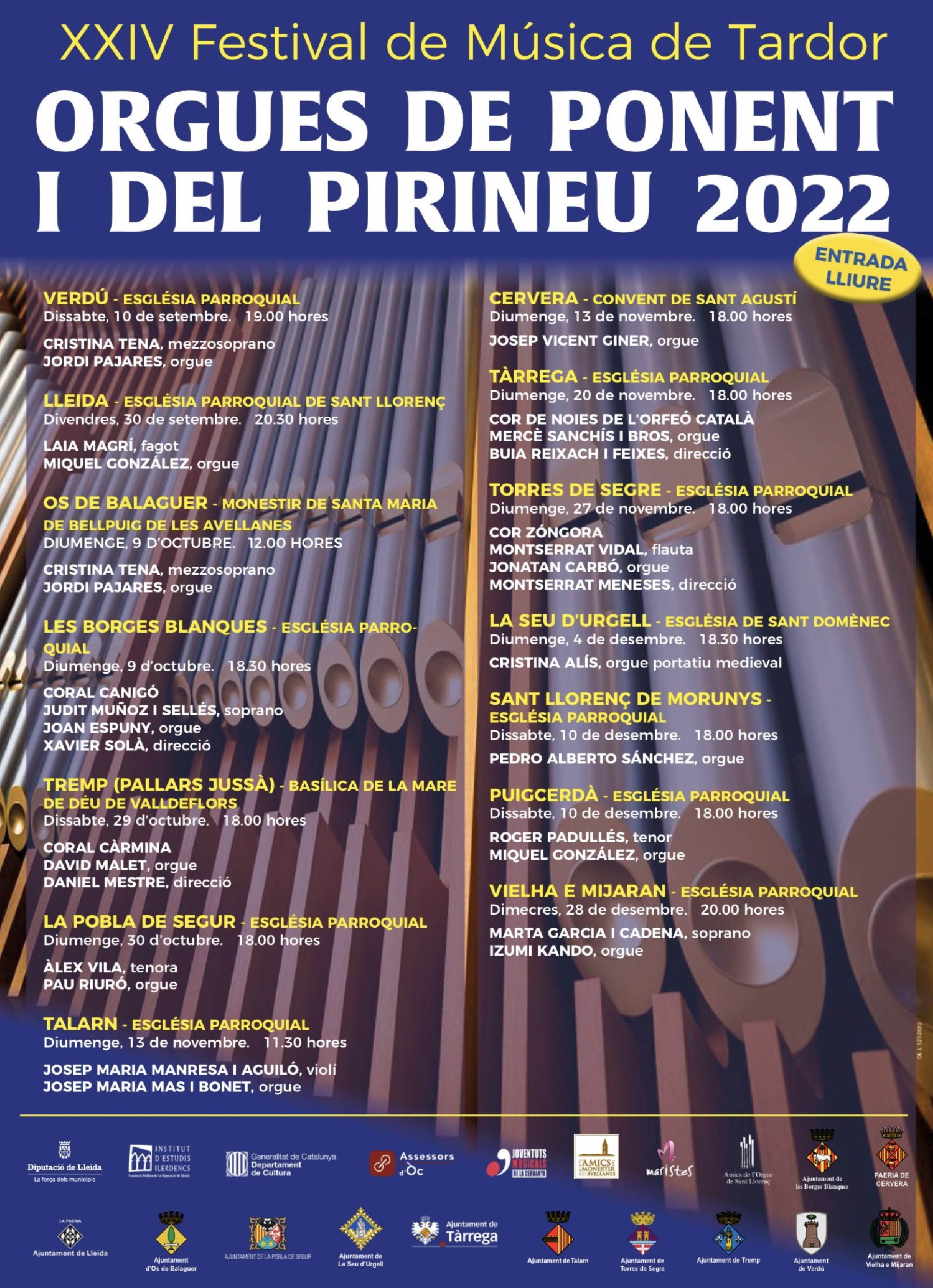 El XXIV Festival ORGUES DE PONENT I DEL PIRINEU 2022 farà parada al monestir de Santa Maria de Bellpuig de les Avellanes el diumenge 9 d'octubre