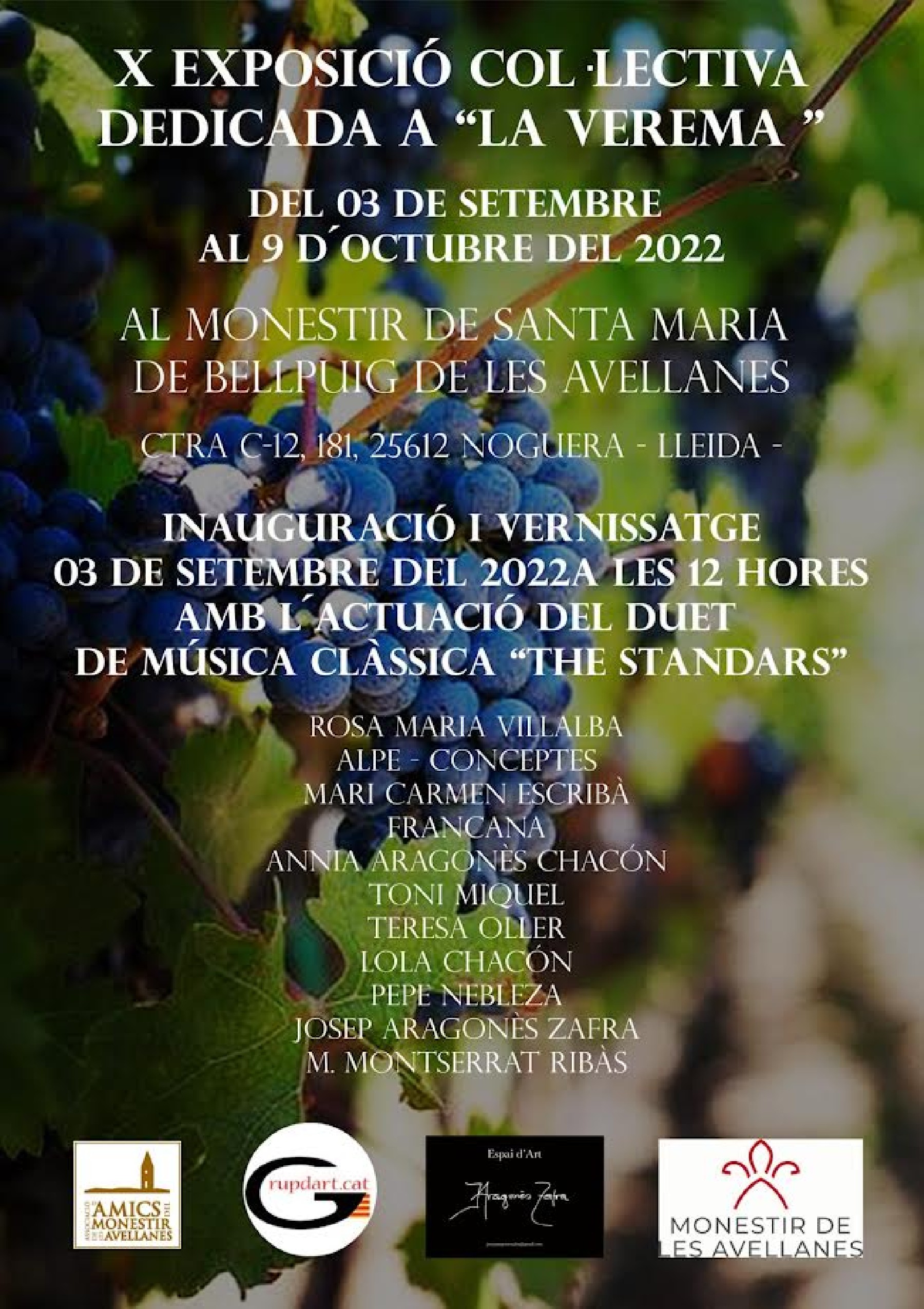 Exposició col·lectiva dedicada a la 'Verema' al Monestir de les Avellanes. Serà la 10a edició d'aquesta iniciativa impulsada pel Grupdart.cat, que per primer cop exposa al Monestir de les Avellanes