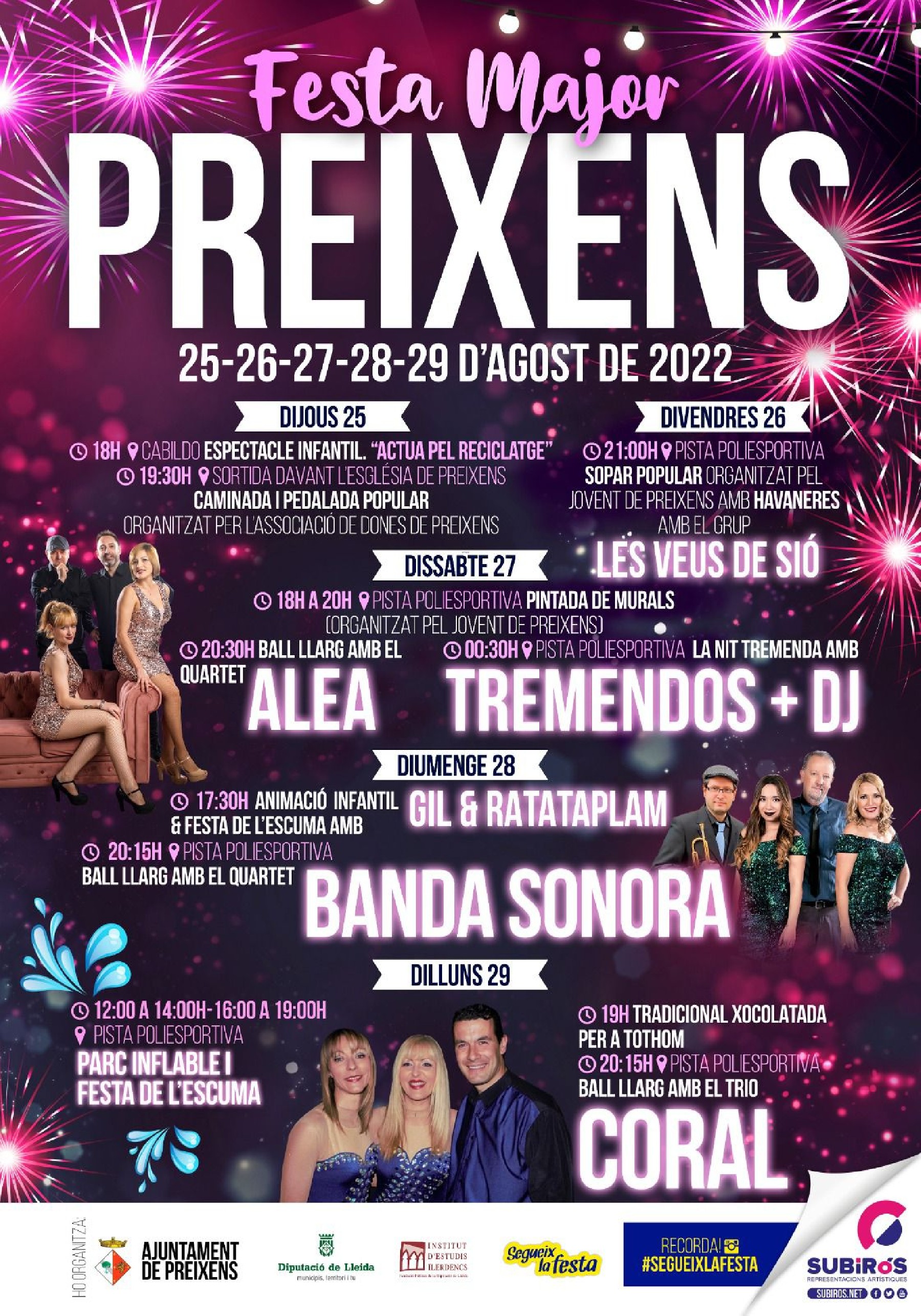 Preixens celebra des d'aquest dijous i fins dilluns la Festa Major. El programa inclou espectacles i festes familiars, a més de música amb les havaneres de les Veus de Sió, el rock del grup Tremendos i el ball de Banda Sonora, Alea i Coral