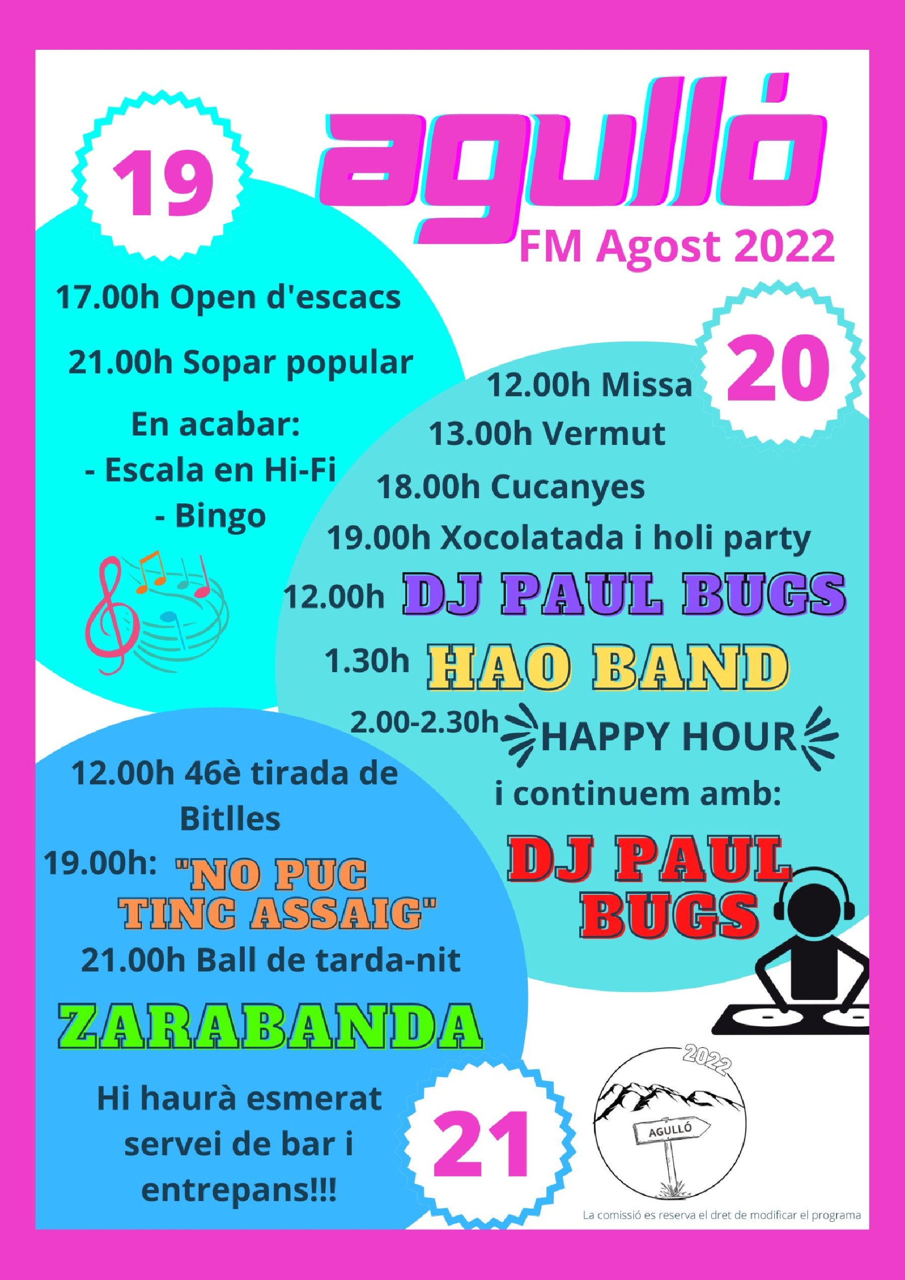 Agulló celebra Festa Major del 19 al 21 d'agost amb un sopar popular, espectacles, balls i el concert del grup Hao Band i el dj Paul Bugs com a actes destacats
