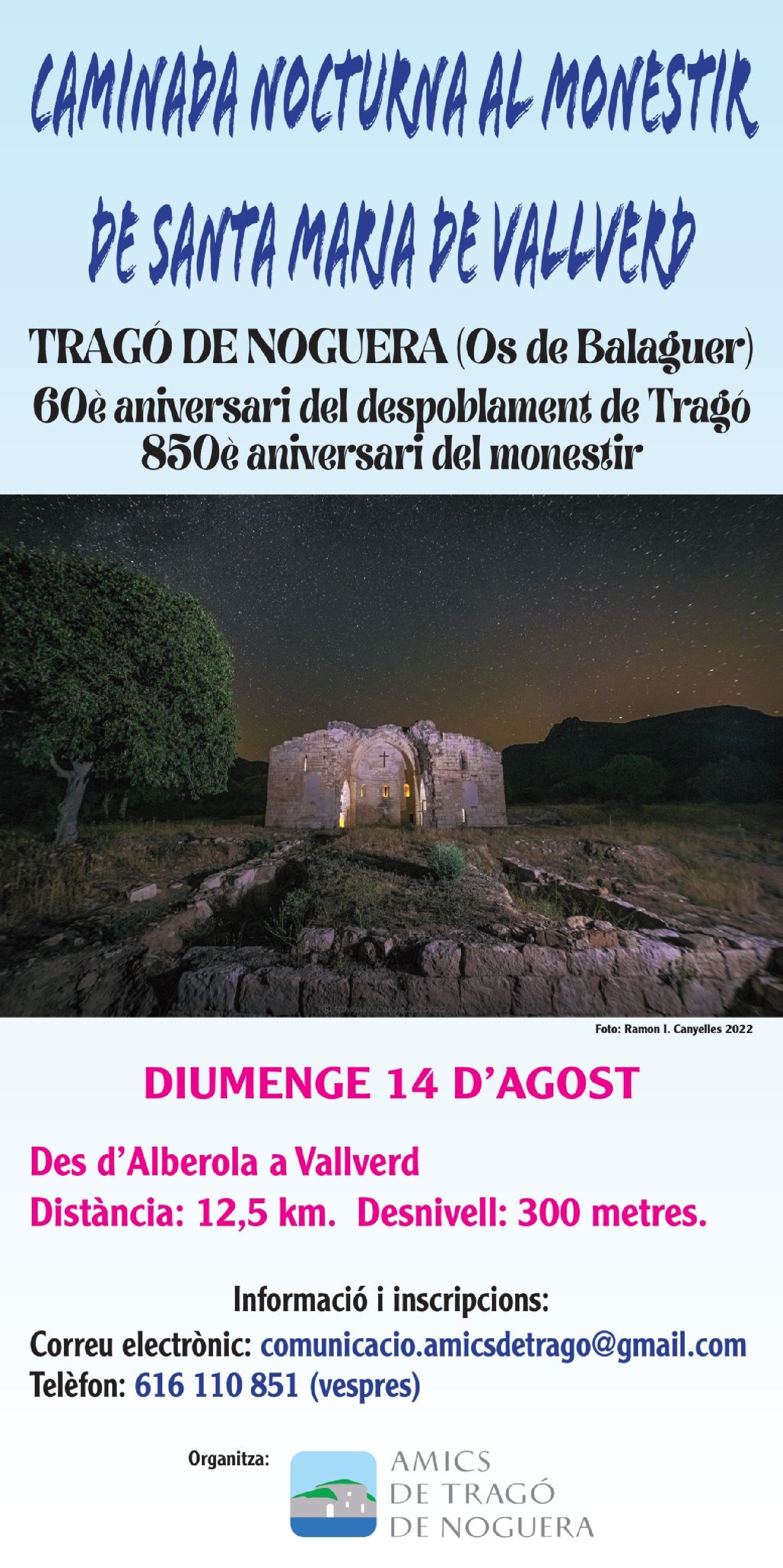 El diumenge 14 d'agost es realitzarà una caminada nocturna al Monestir de Santa Maria de Vallverd, amb sortida des d'Alberola. Es tracta d'una de les activitats incloses dins dels actes del 850è aniversari del monestir