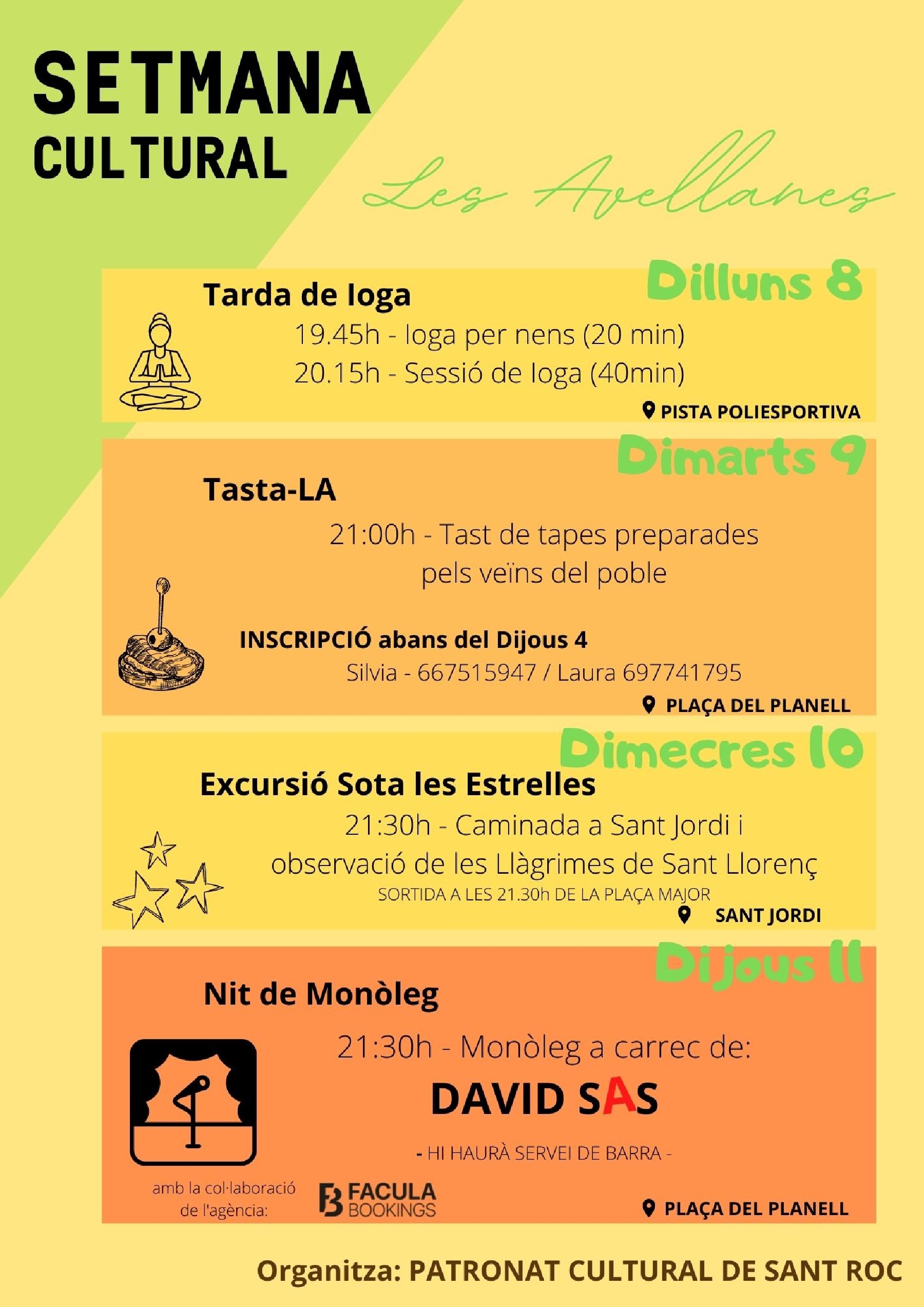 Les Avellanes inicien aquest dilluns una setmana cultural que inclou activitats com tallers de ioga, un tast de tapes, una sortida nocturna i el clouran amb el monòleg de David Sas