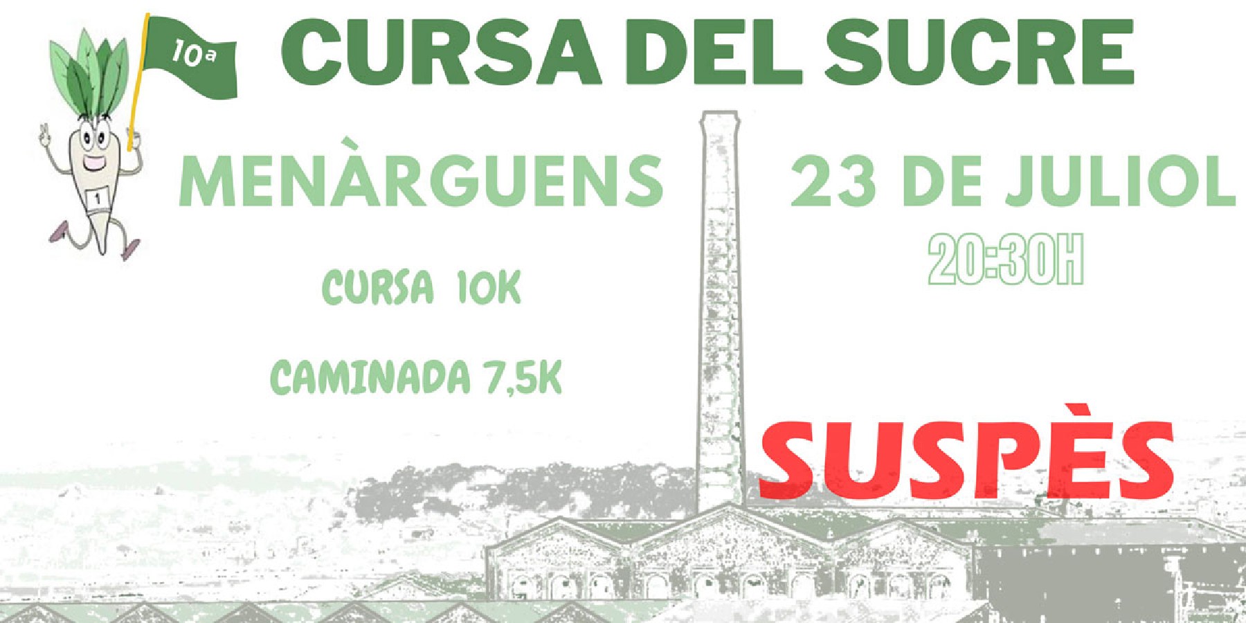 Menàrguens suspèn la 10a edició de la Cursa del Sucre, que s'havia de celebrar aquest dissabte 23 de juliol, per la falta d'inscrits. Les persones que ja havien formalitzat la inscripció rebran l'abonament de l'import pagat