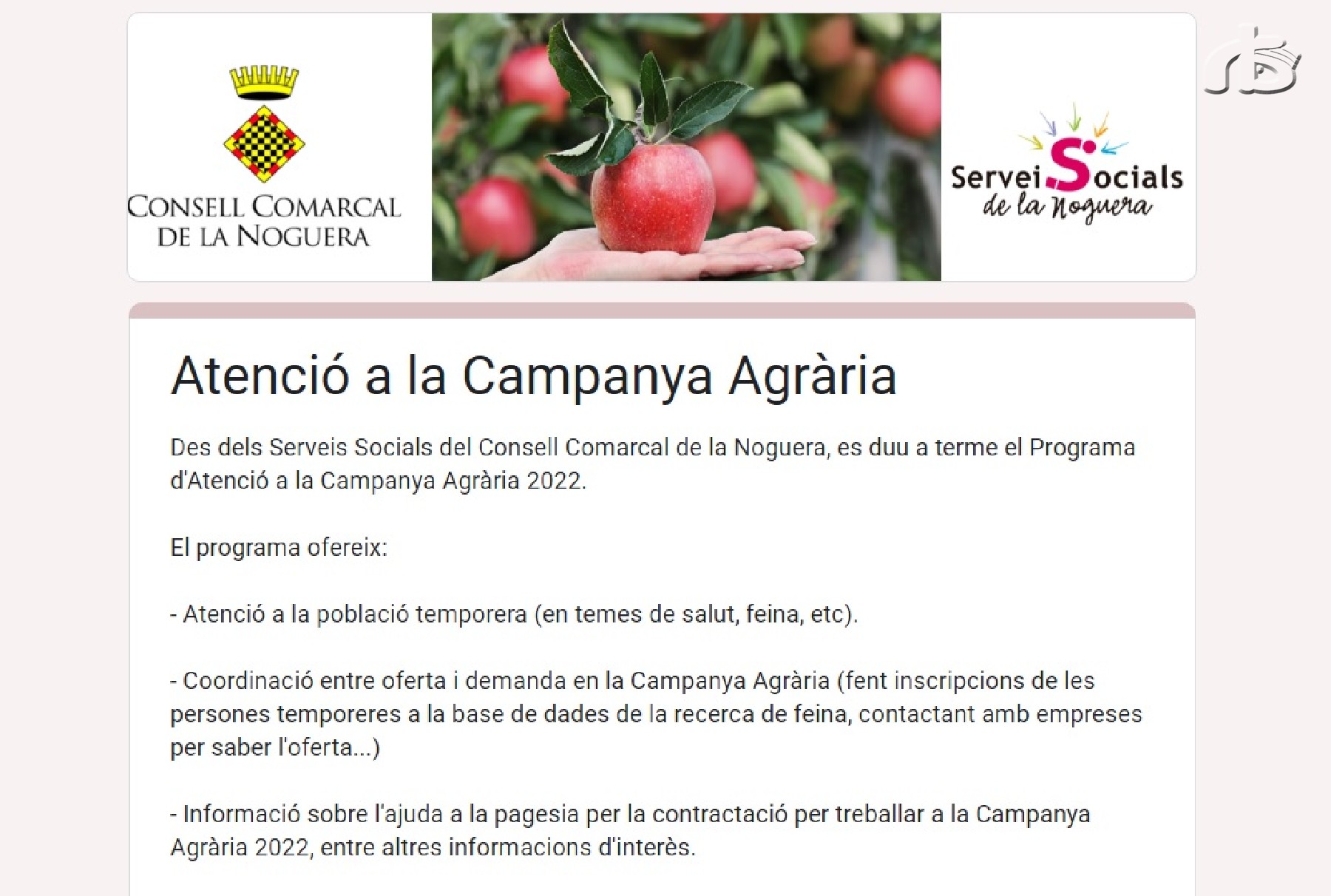 L'àrea de Serveis Socials del Consell Comarcal de la Noguera realitza una enquesta als pagesos de la comarca per detectar necessitats, fer propostes i accions per millorar la qualitat de vida de les persones que treballen en la campanya de la fruita