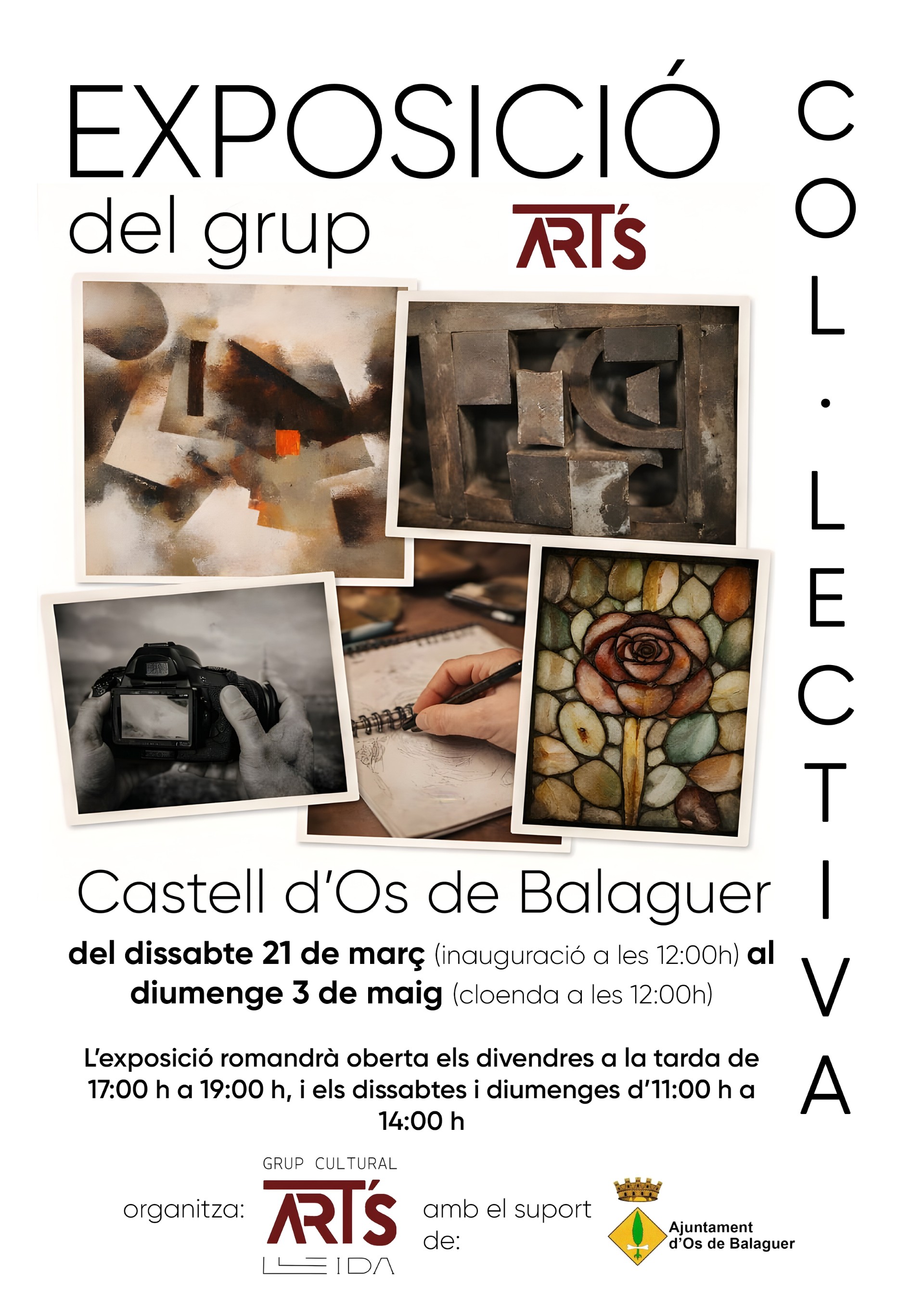 El Castell d’Os de Balaguer acollirà des d’aquest dissabte 21 de març al diumenge 3 de maig una exposició col·lectiva del grup Art’s, un recull artístic que inclou diferents disciplines com pintura, escultura, fotografia i poesia visual