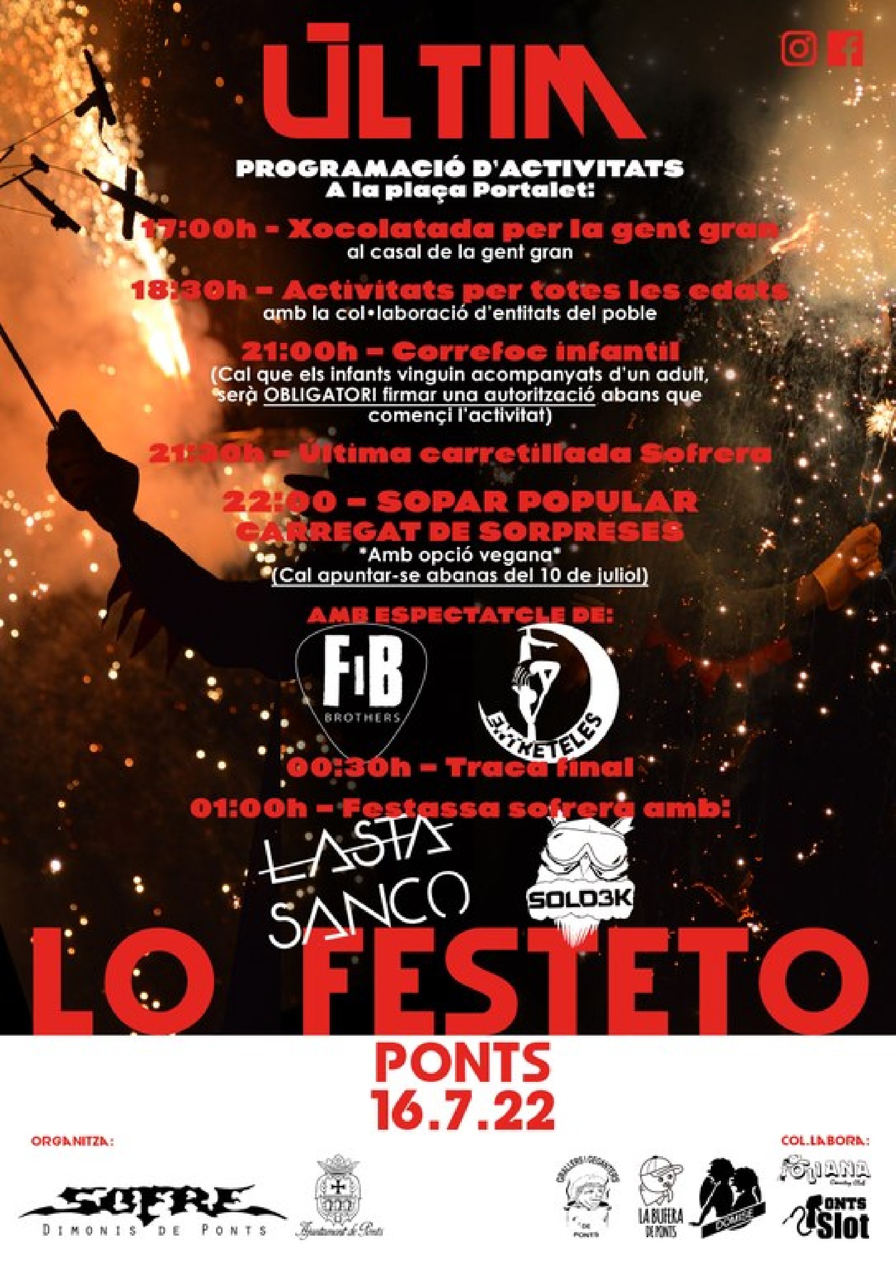 Aquest dissabte es celebra a Ponts 'Lo Festeto', la festa del foc i la cultura catalana que omple el municipi d'activitats per a totes les edats, entre les que destaquen els correfocs, el sopar popular i els concerts