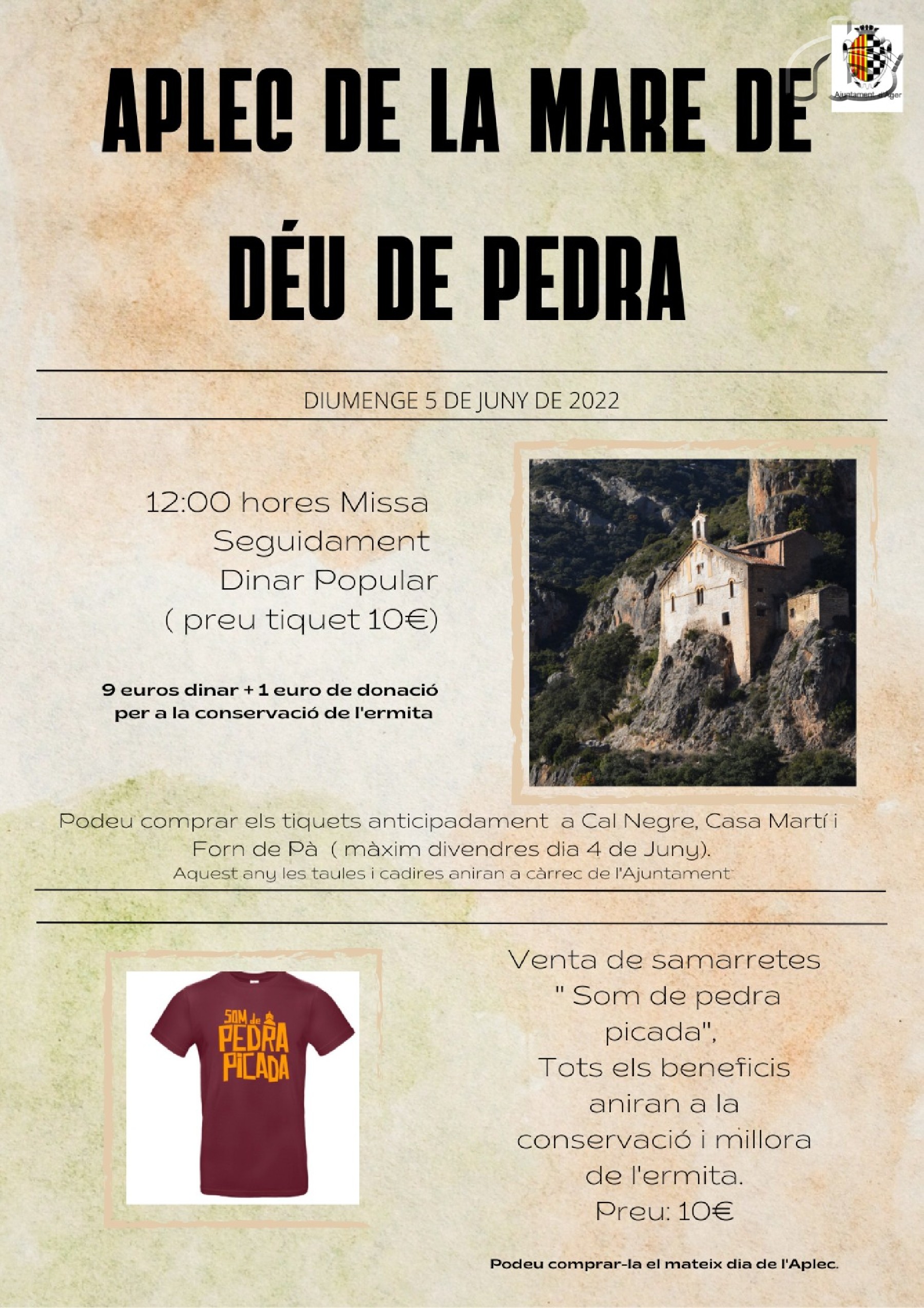 Aquest diumenge es celebrarà l'aplec de la Mare de Déu de Pedra, a Àger. Durant l'aplec es vendran samarretes amb el lema som de pedra picada' per tal de recaptar diners per a la conservació i millora de l'ermita
