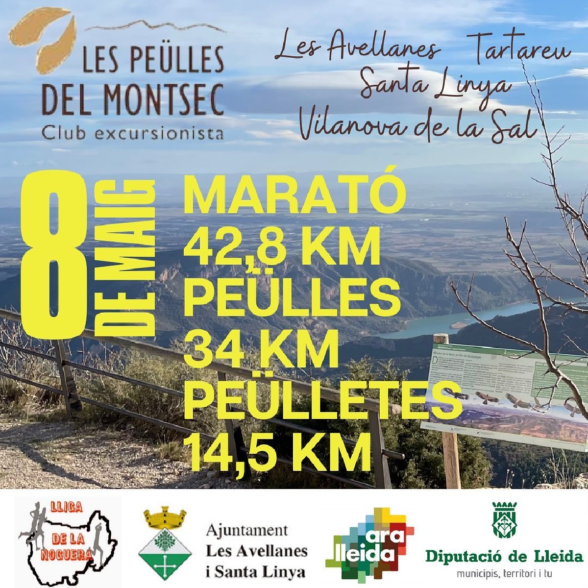Aquest diumenge 8 de maig es disputarà la 8a Marxa Trail i 1a marató Les Peülles del Montsec, tercera prova puntuable de la Lliga de la Noguera que discorre per Les Avellanes, Vilanova de la Sal, Santa Linya i Tartareu