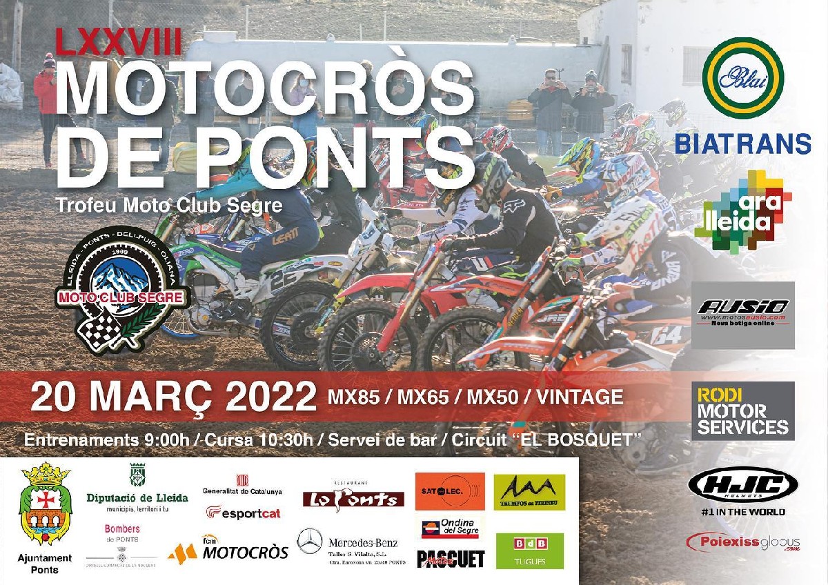 Ponts serà aquest diumenge 20 de març la primera parada del Trofeu Moto Club Segre al 78è Motocròs de Ponts, amb categories MX85, MX65, MX50 i Vintage