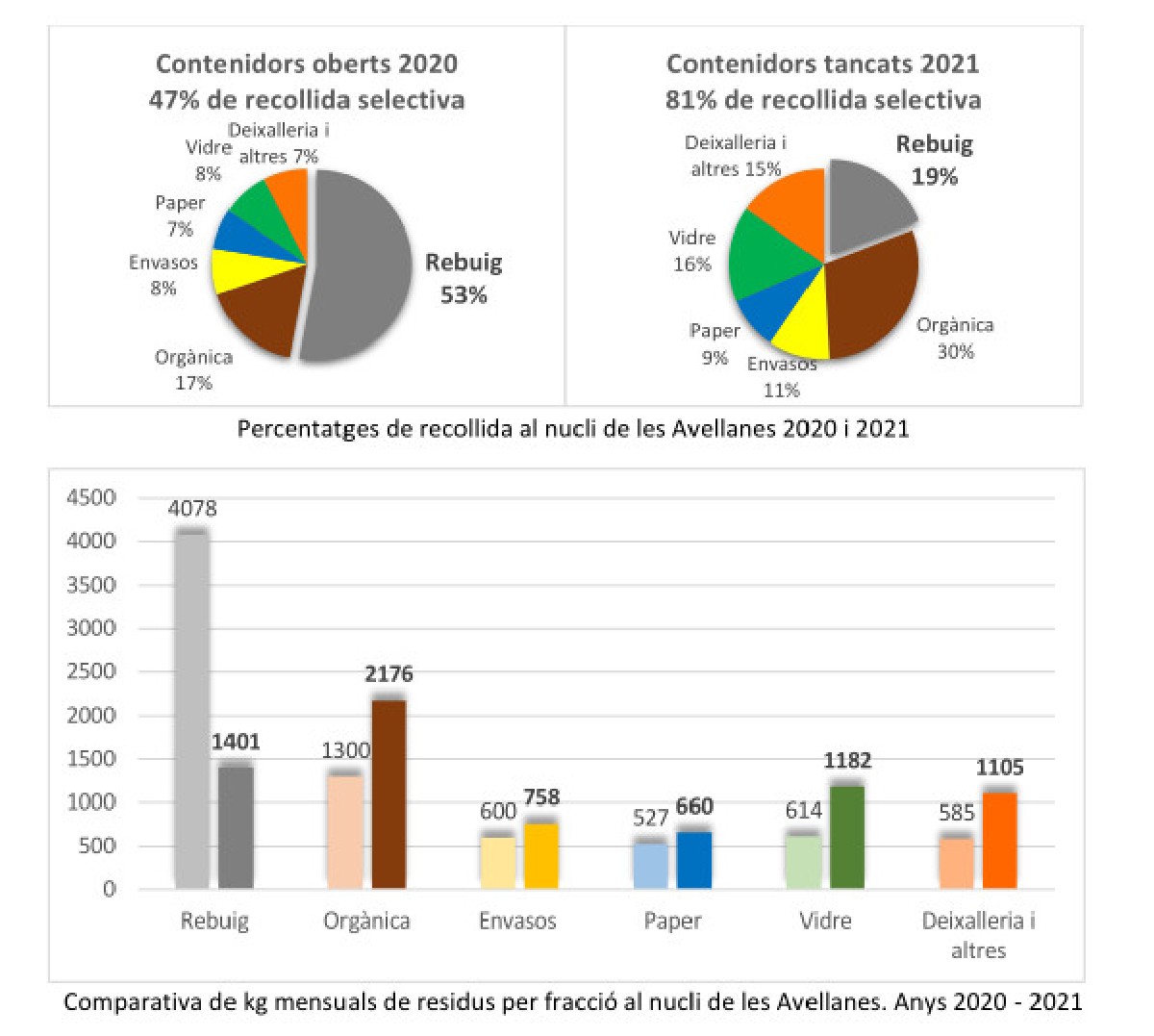 Valoració d'un any de recollida selectiva amb contenidors tancats a les Avellanes. Els residus recollits selectivament augmenten fins al 81 % del total de residus