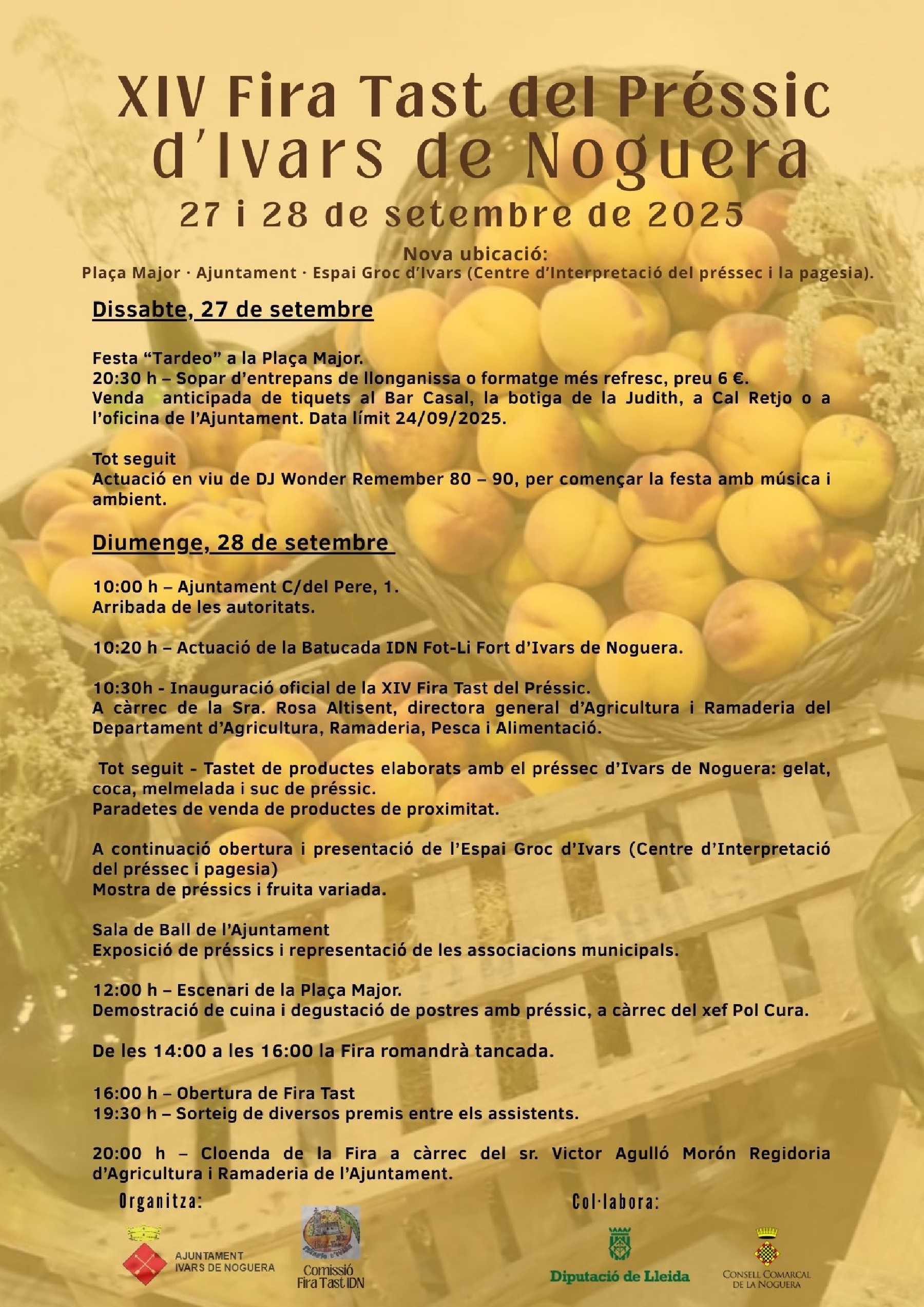 Ivars de Noguera tornarà a posar en valor el seu producte estrella amb la XIV Fira Tast del Préssec, que enguany se celebrarà els dies 27 i 28 de setembre i estrenarà nova ubicació, inaugurant el Centre d'Interpretació del préssec
