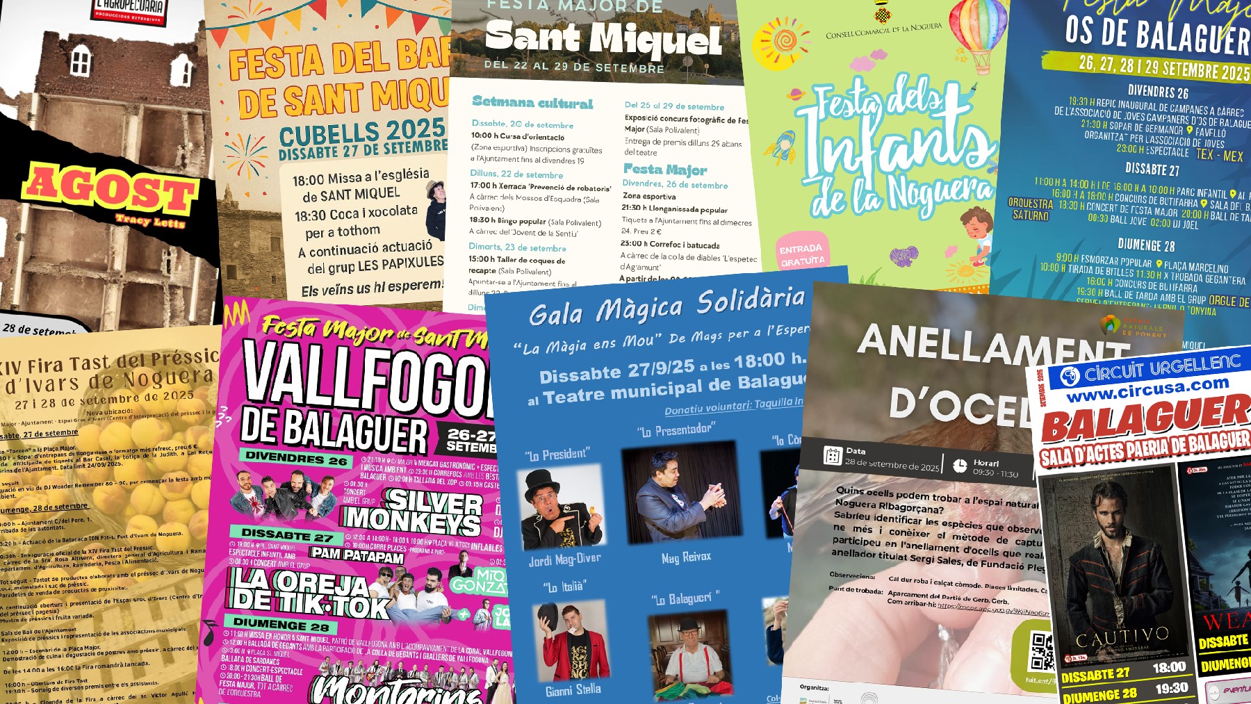 El Teatre municipal de Balaguer acull aquest dissabte una gala solidària de màgia. A comarca és festa major a Vallfogona, Os de Balaguer, Artesa de Segre i La Sentiu. A més a Ivars de Noguera es fa la Fira del Préssec