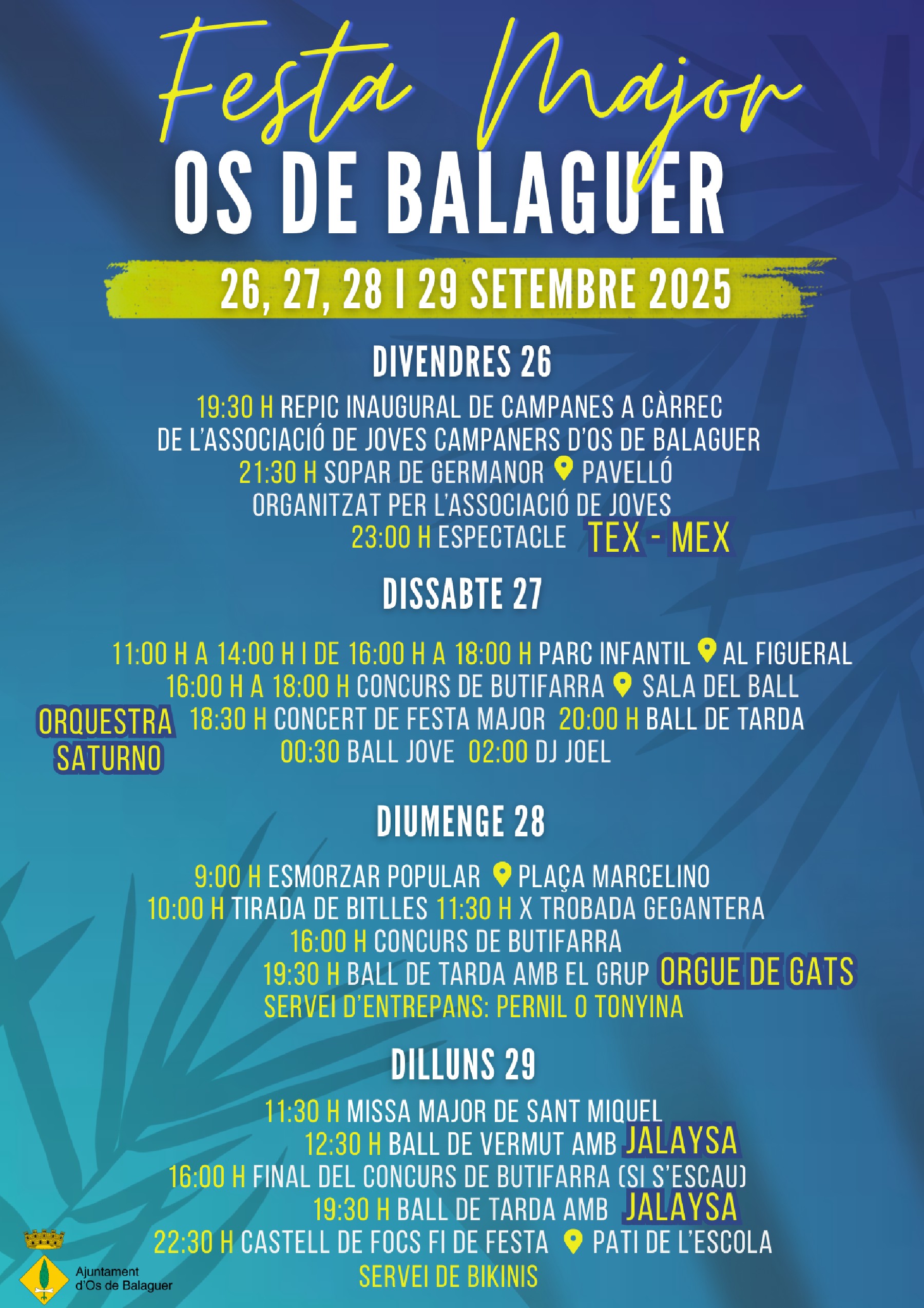 Os de Balaguer es prepara per viure quatre dies intensos de Festa Major en honor a Sant Miquel, del 26 al 29 de setembre de 2025. El programa combina tradició, música, activitats infantils i propostes lúdiques per a totes les edats