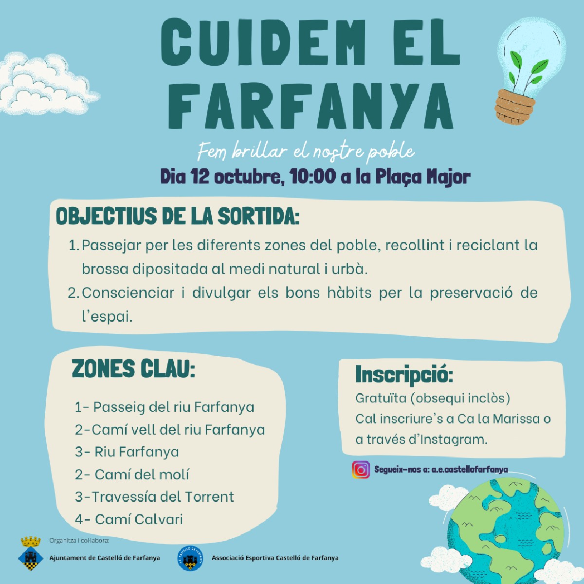 Castelló de Farfanya ha organitzat pel proper dimarts 12 d'octubre una caminada amb l'objectiu de netejar els espais del municipi. Sota el nom de 'Cuidem el Farfanya' es donarà la sortida a les 10 h des de la Plaça Major