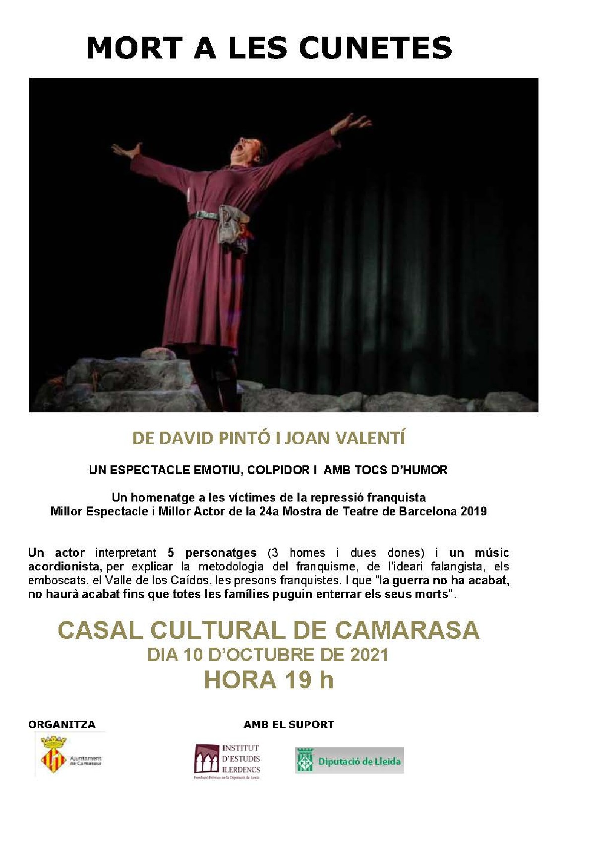 El Casal Cultural de Camarasa serà escenari diumenge a les 7 de la tarda de la representació de l'obra 'Mort a les cunetes' de David Pintó i Joan Valentí. Un homenatge a les víctimes de la repressió franquista