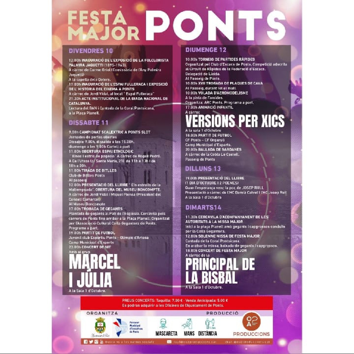 Ponts celebra aquest cap de setmana la seva Festa Major, que s'allargarà fins dimarts amb propostes per a tots els públics. La Trobada Gegantera, el Torneig d'Escacs i els concerts amb La Principal de la Bisbal i Versions per Xics en destaquen al cartell