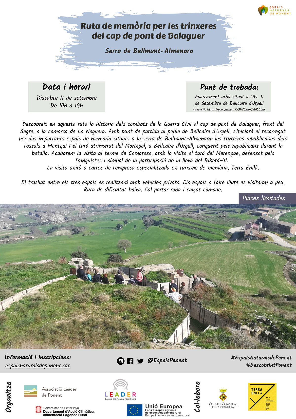 Aquest dissabte de 10 a 2 del migdia els Espais Naturals de Ponent organitzen una sortida des de Bellcaire per descobrir les trinxeres del Cap de Pont de Balaguer