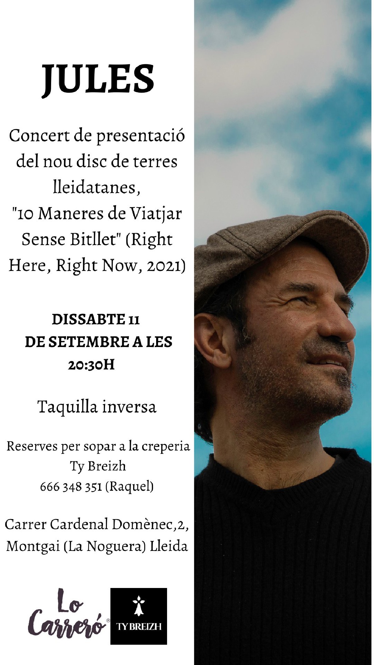 El músic barceloní Jules presentarà aquest dissabte a Lo Carreró de Montgai el seu nou disc '10 maneres de viatjar sense bitllet'. El concert a 2/4 de 10 de la nit i serà amb taquilla inversa. Precisament Jules publica aquest divendres aquest disc