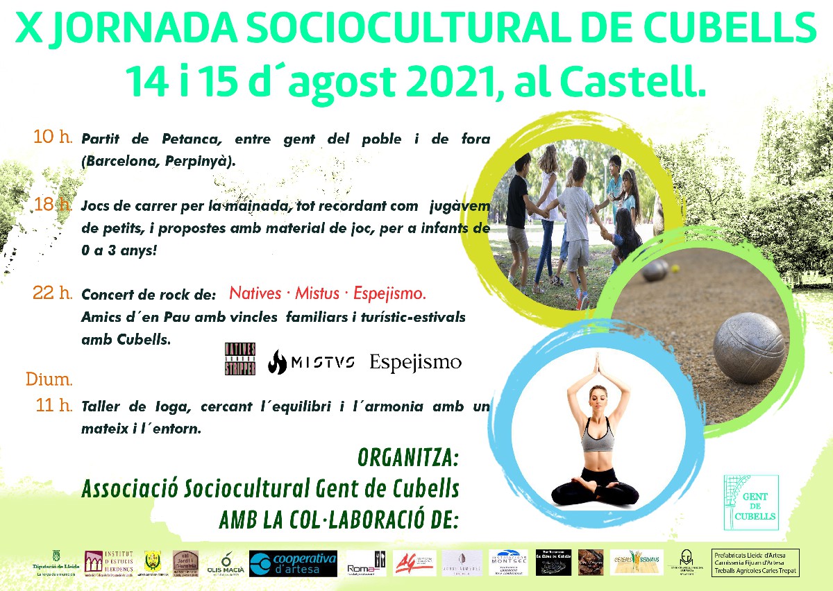 Aquest cap de setmana del 14 i 15 d'agost tindrà lloc la X Jornada Sociocultural de Cubells. Inclourà tallers de jocs, un concert de rock i un taller de ioga