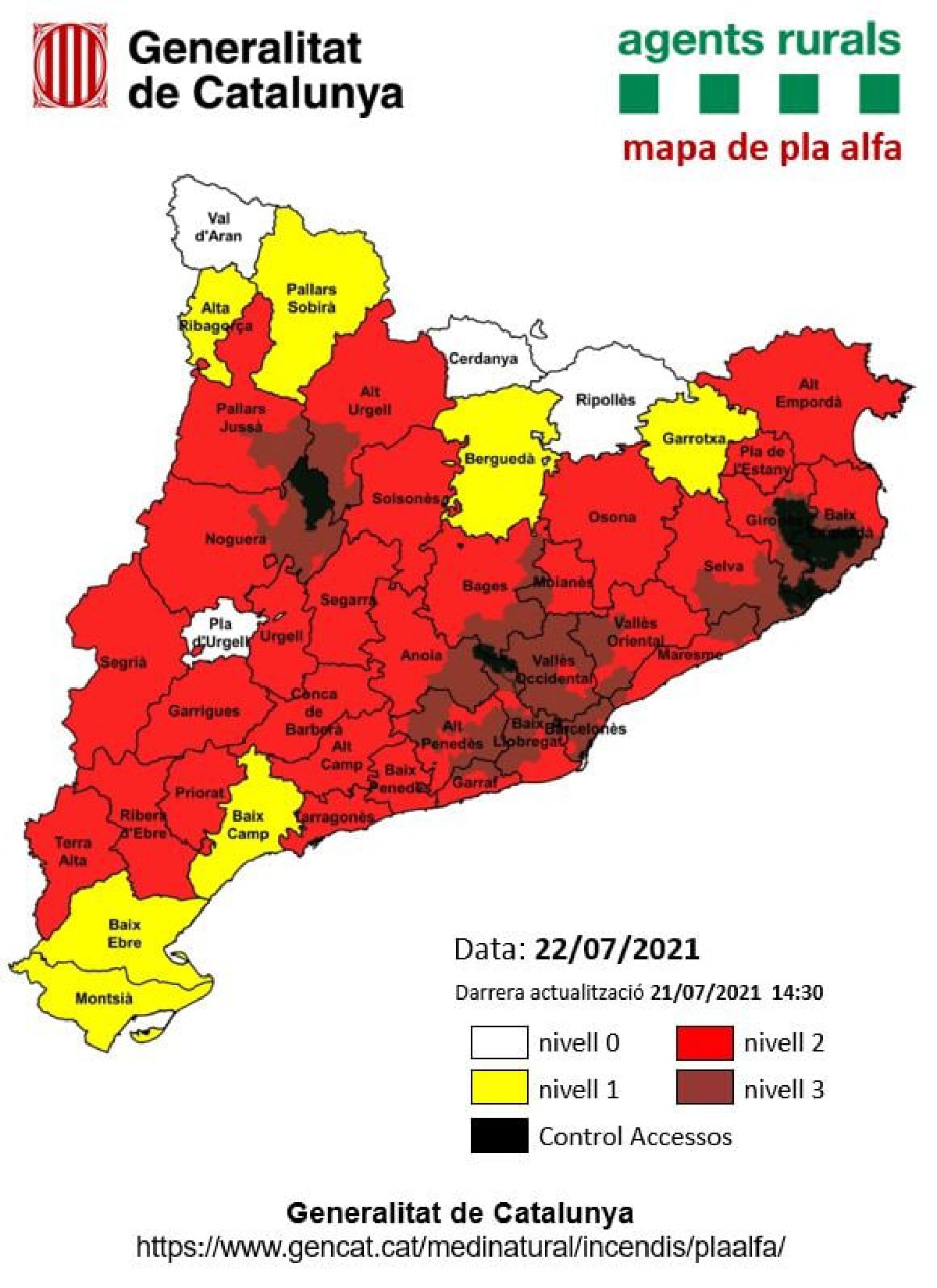 El perill d'incendi dels propers tres dies serà molt alt a tot Catalunya. 5 municipis de la Noguera: Artesa de Segre, La Baronia de Rialb, Oliola, Ponts, Tiurana i Vilanova de l'Aguda, al Pla Alfa de nivell 3 de risc d'incendi demà dijous