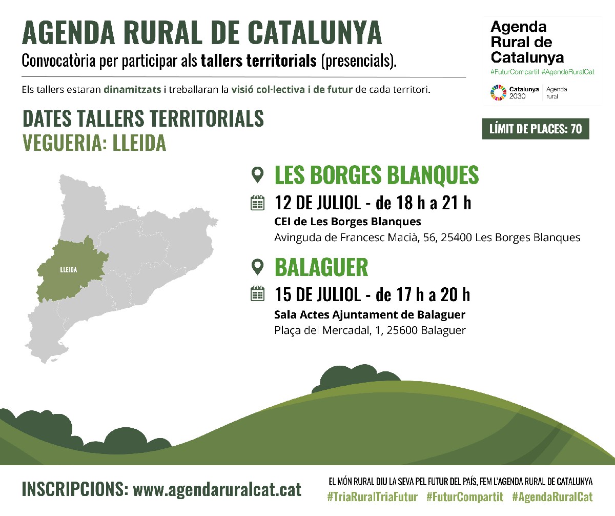 S'obre les inscripcions als tallers territorials de l'Agenda Rural de Catalunya que es realitzaran del 12 al 20 de juliol. El Dijous 15 de juliol e durà a terme un a Balaguer. La data límit per a inscriure-s'hi són 4 dies abans de cada taller
