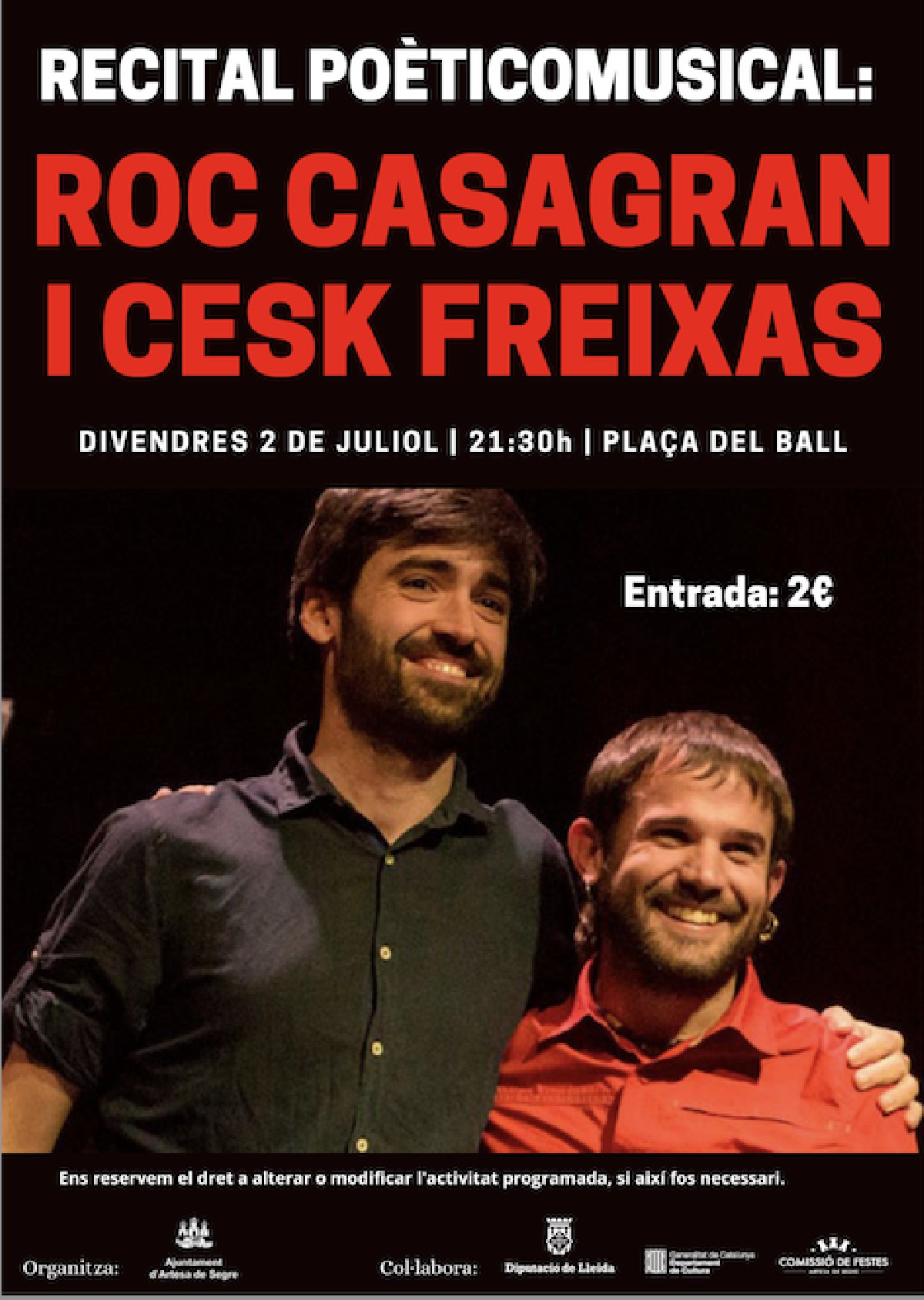 Artesa de Segre acull aquest divendres 2 de juliol un recital poèticomusical amb Ric Casagran i Cesc Freixas. Serà a 2/4 de 10 de la nit i a la Plaça del Ball