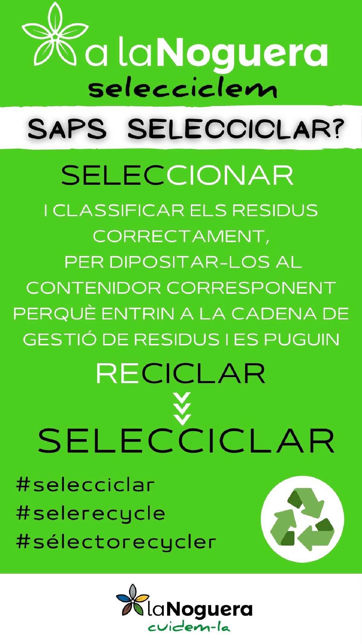 El Consell Comarcal de la Noguera vol donar un impuls a la recollida selectiva de tota la comarca per aconseguir els percentatges de reciclatge que exigeix la Unió Europea i posa en marxa la campanya 'A la Noguera SELECCICLEM'