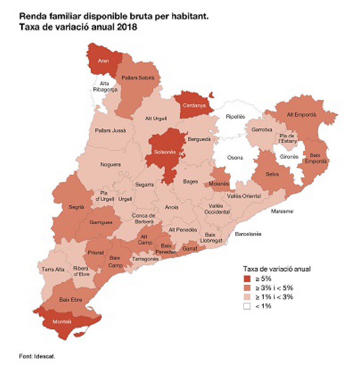 La Cerdanya i el Solsonès són les comarques on més augmenta la renda per habitant l'any 2018. A la cua, l'Alt Urgell i la Noguera, totes dues amb una renda per habitant de 13.800 euros i el Montsià amb 12.900 euros.