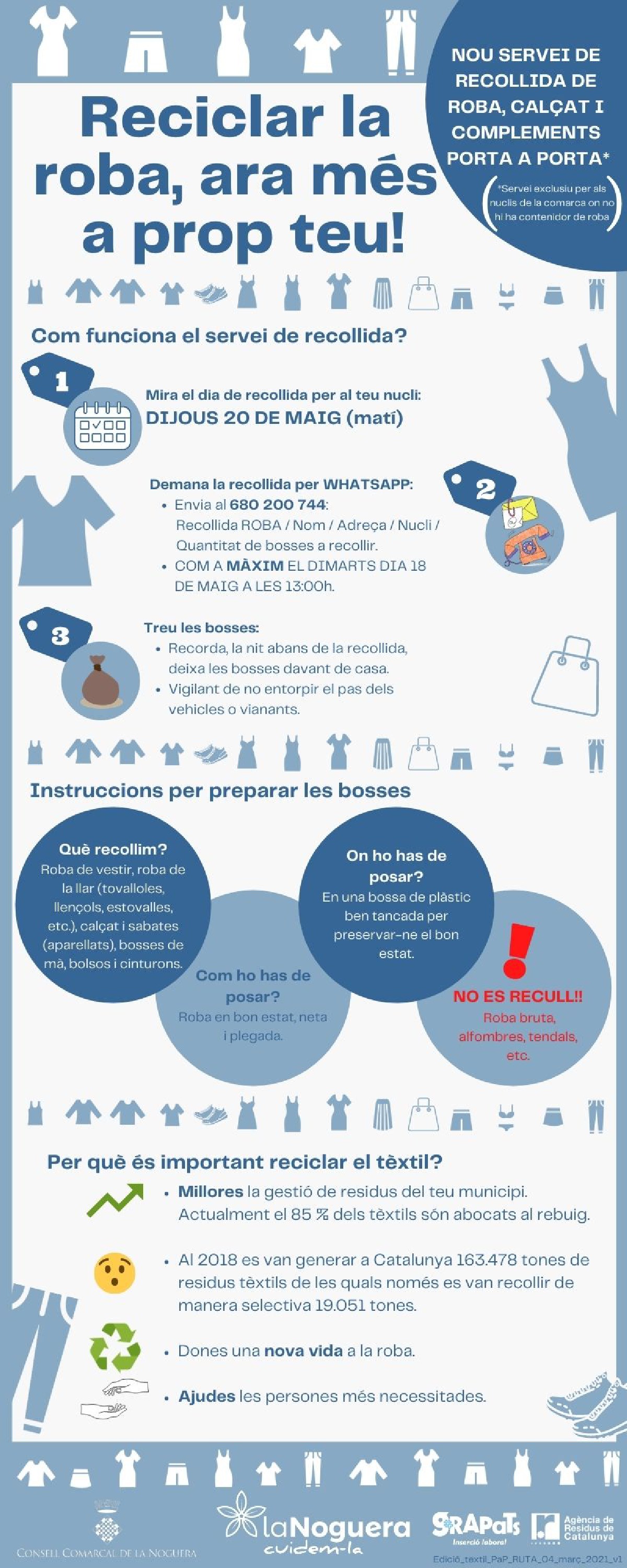 El Consell Comarcal de la Noguera inicia un servei de recollida de roba i calçat pels nuclis de la comarca on no hi ha contenidors de roba. Es realitzaran dos recollides anuals coincidint amb el canvi de temporada de roba