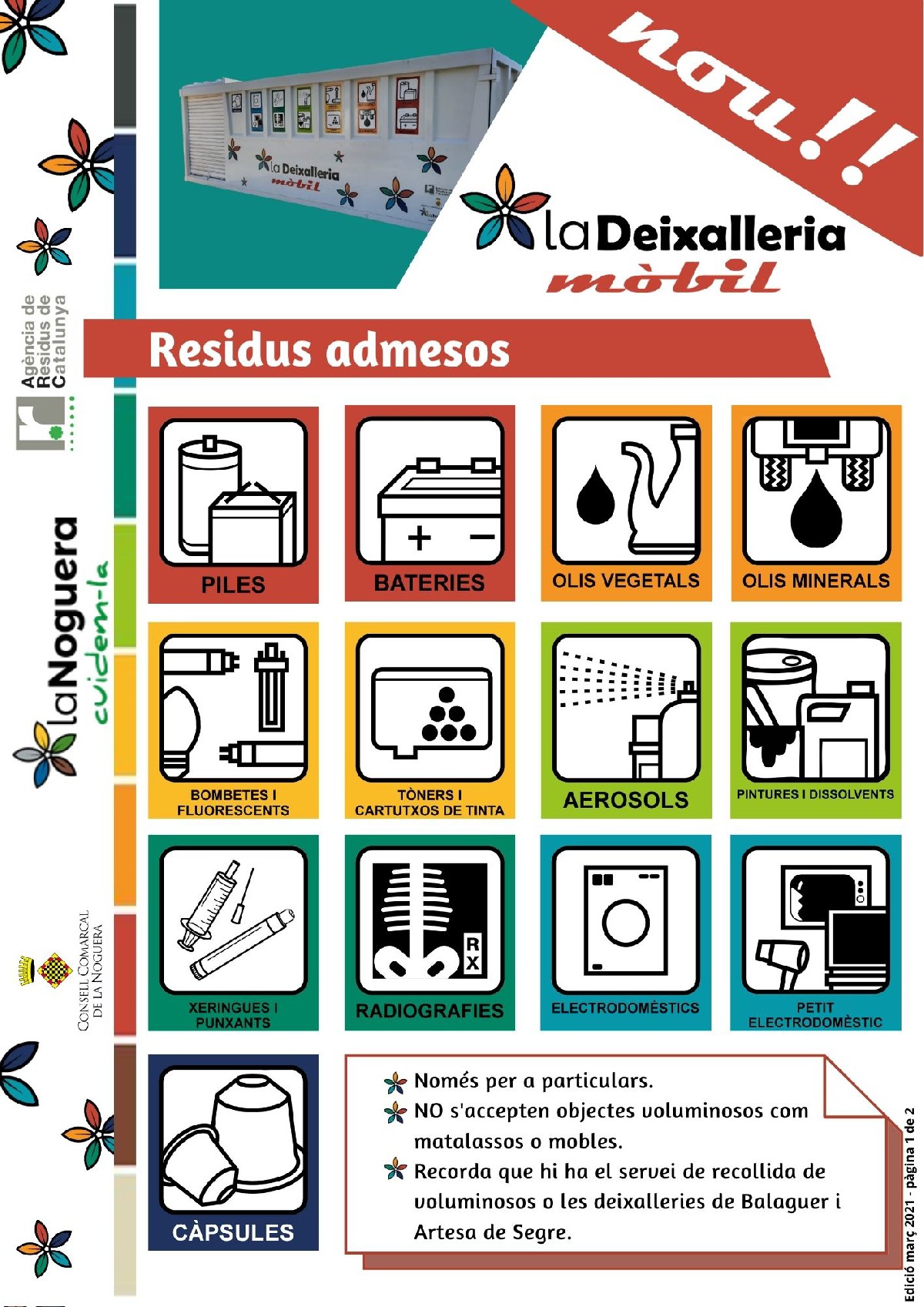 A partir del mes d'abril el Consell Comarcal de la Noguera tornarà a prestar el Servei de Deixalleria Mòbil als diferents municipis de la comarca que ho sol·licitin.