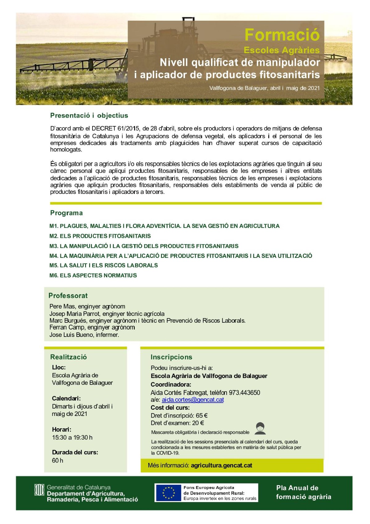 L'Escola Agrària de Vallfogona de Balaguer programa 3 cursos per a agricultors i ramaders. Es tracta d'un curs d'apicultura, un d'aplicador de productes fitosanitaris i un del maneig bàsic del Cavall. Es faran entre abril i maig