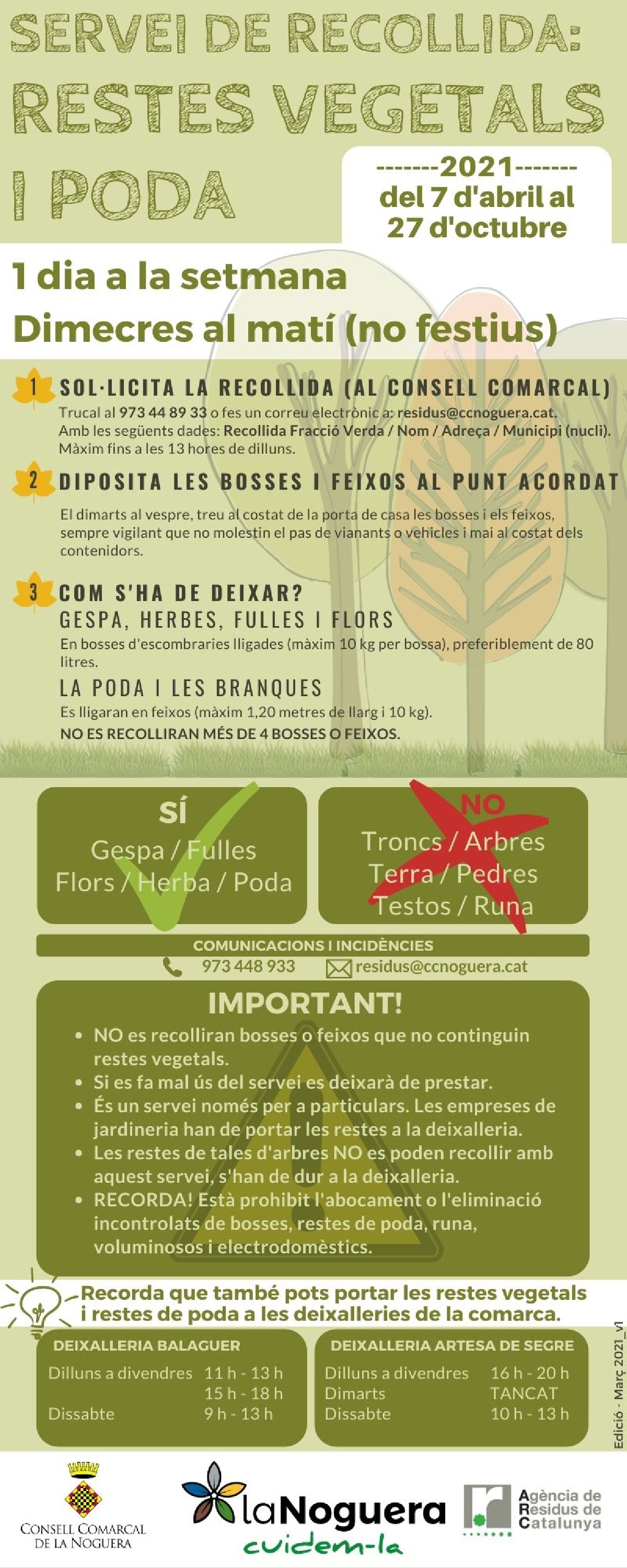 El Consell Comarcal de la Noguera reprendrà a partir del 7 d'abril el servei de recollida de restes vegetals i de poda. L'any passat va funcionar com a prova pilot en 13 municipis i aquest any seran 15 després que s'hi han sumat Preixens i Les Avellanes