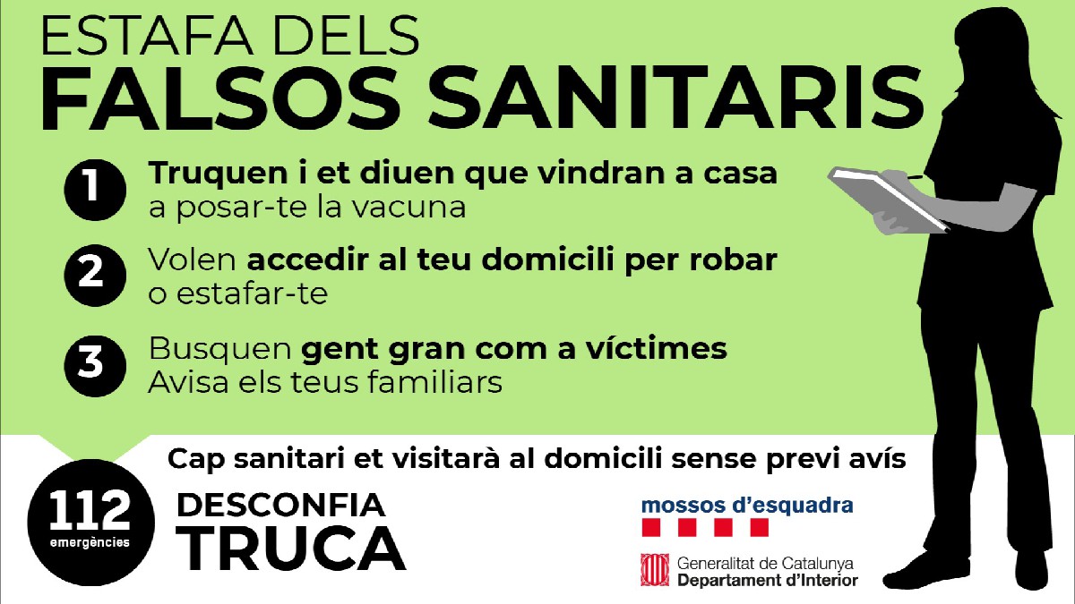 Els Mossos d'Esquadra alerten d'una nova modalitat d'estafa amb la vacuna de la Covid-19. Els estafadors es fan passar per sanitaris i intenten accedir als domicilis amb l'excusa d'administrar la vacuna