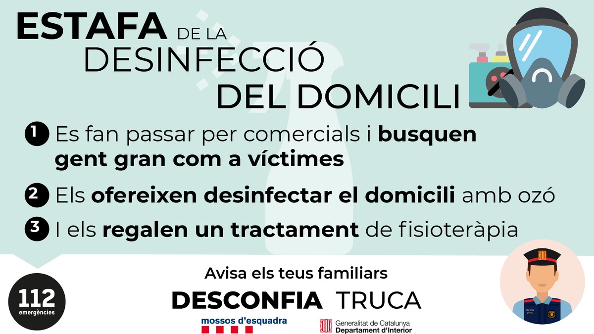 Els Mossos d'Esquadra alerten d'un nou intent d'estafa consistent en oferir un servei de desinfecció del domicili amb ozó. L'estafa s'adreça principalment a gent gran als que s'ofereix un tractament de fisioteràpia per ser més convincents