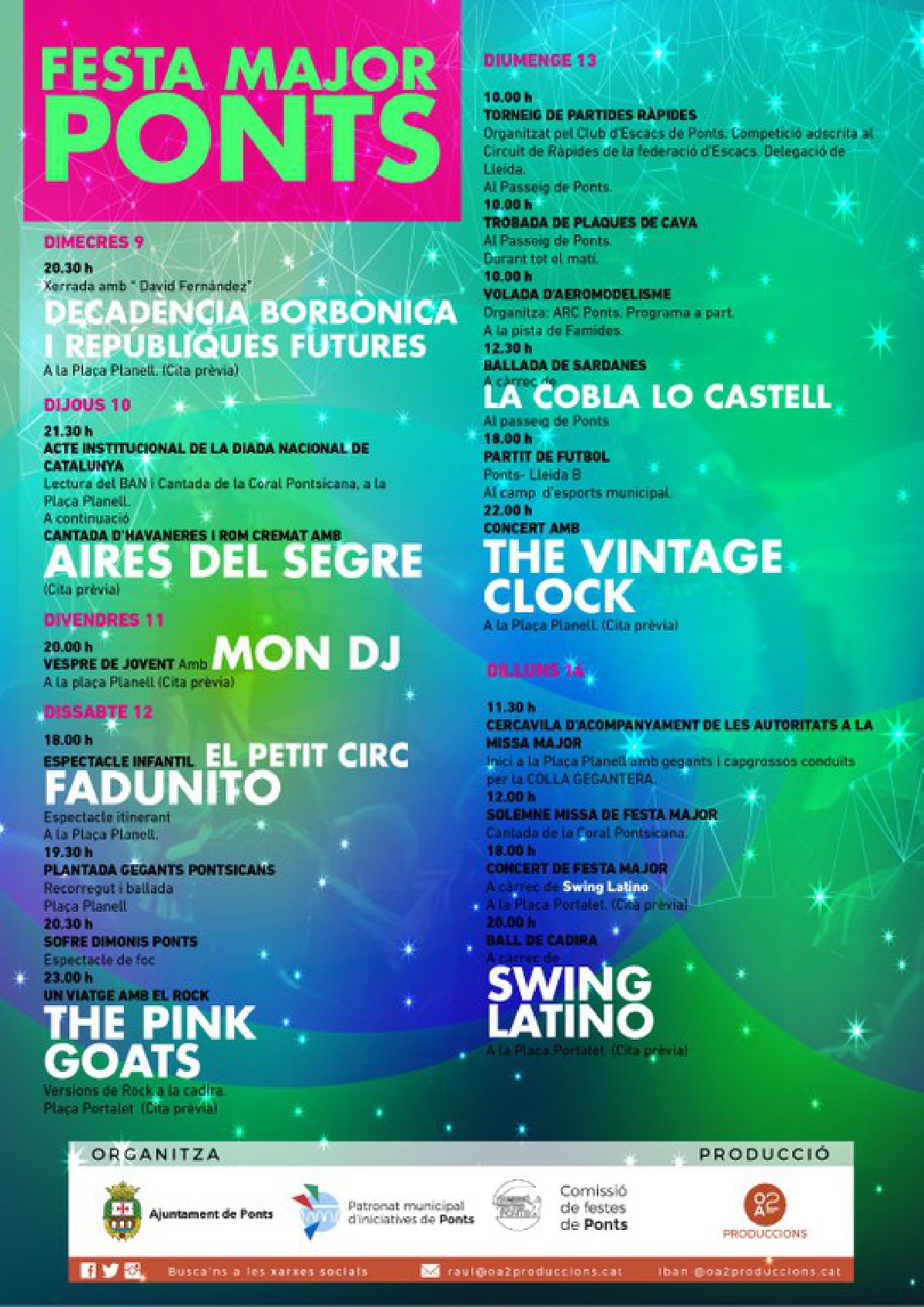 Ponts celebra del 9 al 14 de setembre la seva Festa Major, en que no es faran actes nocturns i els tradicionals balls es faran en format de concert. A més, caldrà cita prèvia per assistir-hi