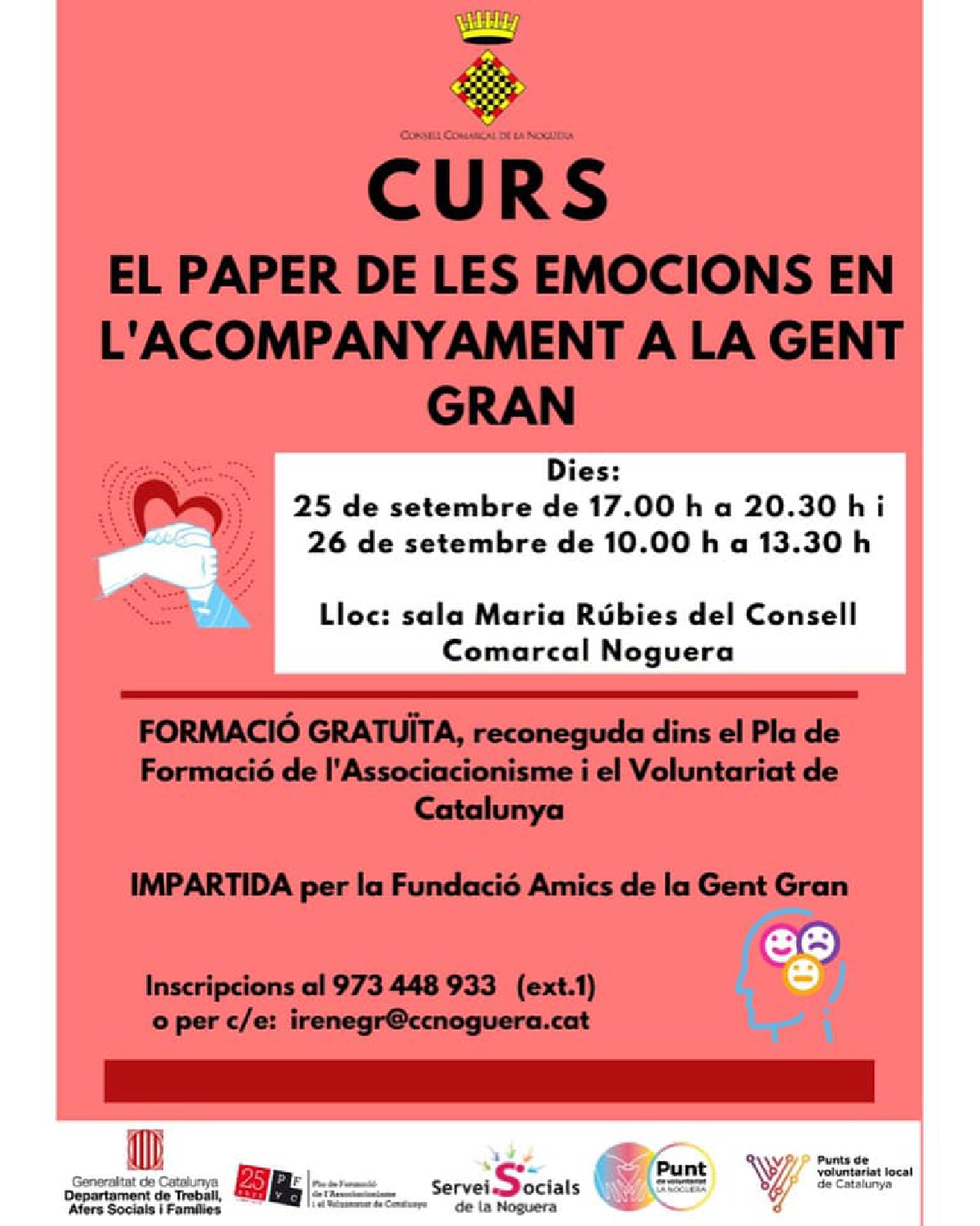 El Punt de Voluntariat del Consell Comarcal de la Noguera organitza el curs 'El paper de les emocions en l'acompanyament a la gent gran'.