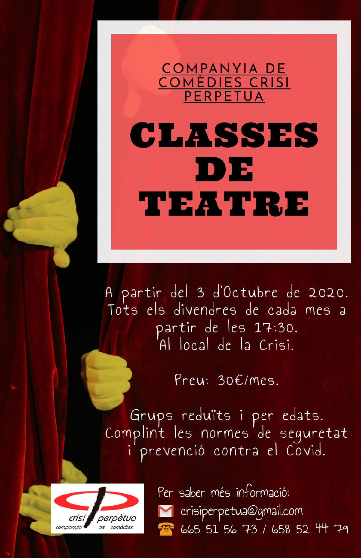La companyia de teatre Crisi Perpètua ha obert el període d'inscripcions per formar part de l'Aula de teatre, que s'articularà en grups reduïts adreçats a 3 segments: infantil, joves i adults, amb classes tots els divendres.