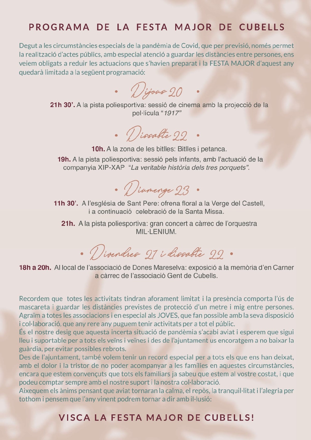 Aquest cap de setmana celebra la seva Festa Major Cubells, amb una programació retallada per la situació actual. La companyia Xip-Xap, l'orquestra Mil·lenium i una exposició a la memòria d'en Carner són alguns actes