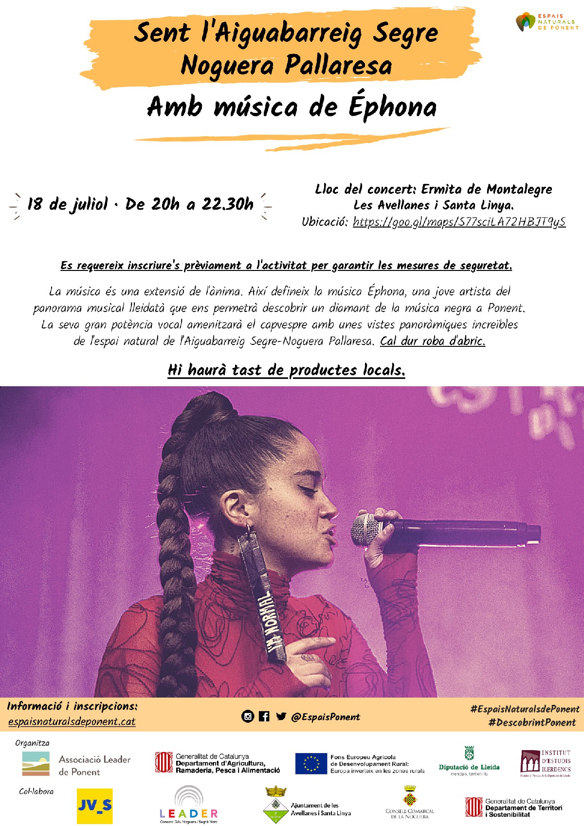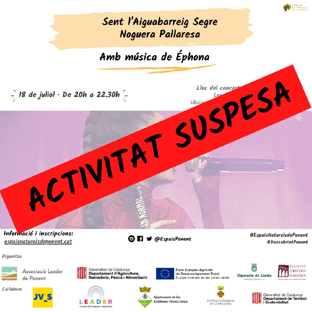 El concert de l'artista lleidatana Éphona previst per aquest dissabte 18 de juliol a l'ermita de Montalegre queda suspès a causa de la prohibició de realitzar activitats culturals a la comarca de la Noguera