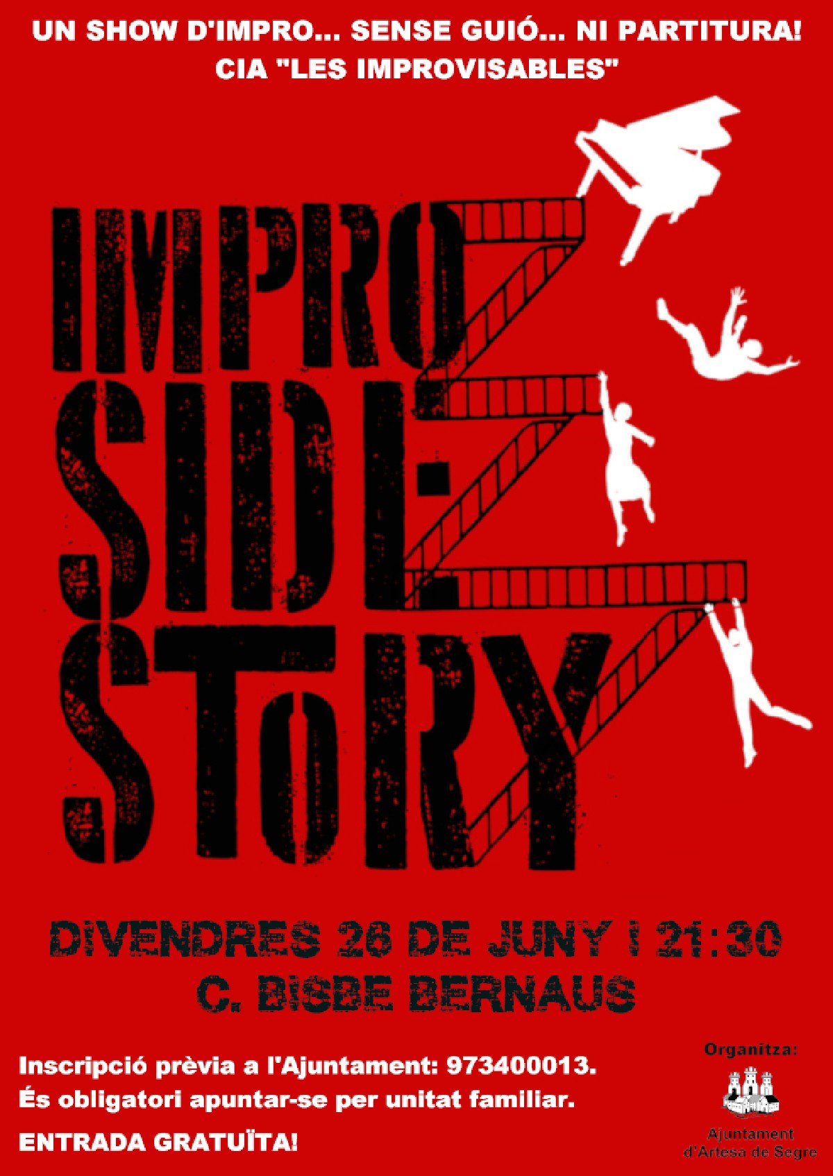 Artesa de Segre programa aquest divendres 26 de juny a 2/4 de 10 de la nit l'espectacle gratuït Impro Side Story, un musical improvisat. Per assistir-hi cal reserva prèvia.